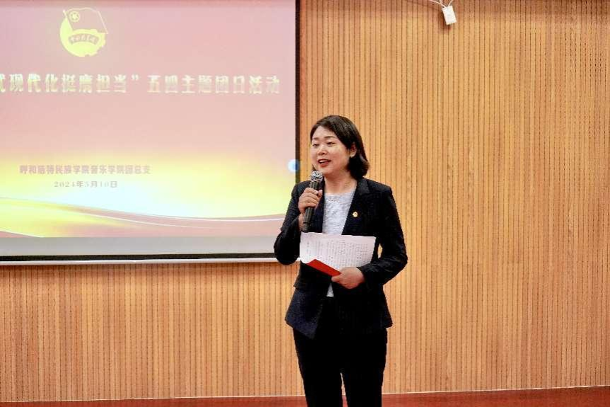 为深入学习宣传贯彻习近平总书记五四青年节对全国广大青年寄语精神,弘扬和传承五四精神,5月10日下午,音乐学院 2022 级音乐学班团支部在音乐楼多功能厅开展了“青春为中国式现代化挺膺担当”五四主题团日活动。校党委副书记格根哈斯出席并讲话。
