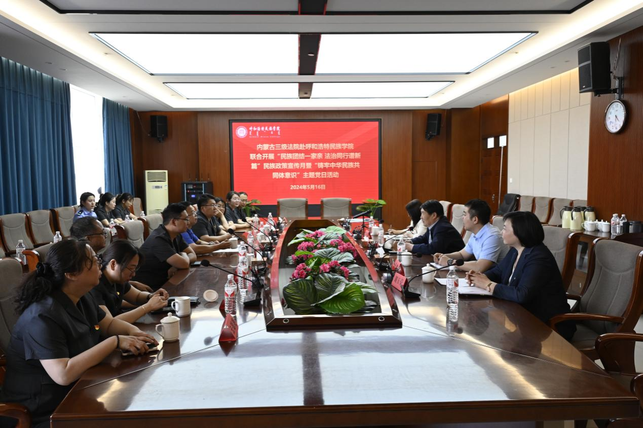 5月16日下午,时值“民族政策宣传月”,又逢“民族法制宣传周”到来之际,best365联合自治区三级法院以铸牢中华民族共同体意识为主线,共同开展“民族团结一家亲 法治同行谱新篇”民族政策宣传月暨“铸牢中华民族共同体意识”主题党日活动。自治区高级人民法院立案庭庭长刘洪舫,呼市中级人民法院政治部副主任于宏,新城区人民法院院长赵俊平等一行35人,best365党委委员、统战部部长包君,党委委员、组织部部长吴阿古拉,法学院领导班子成员参加了活动。