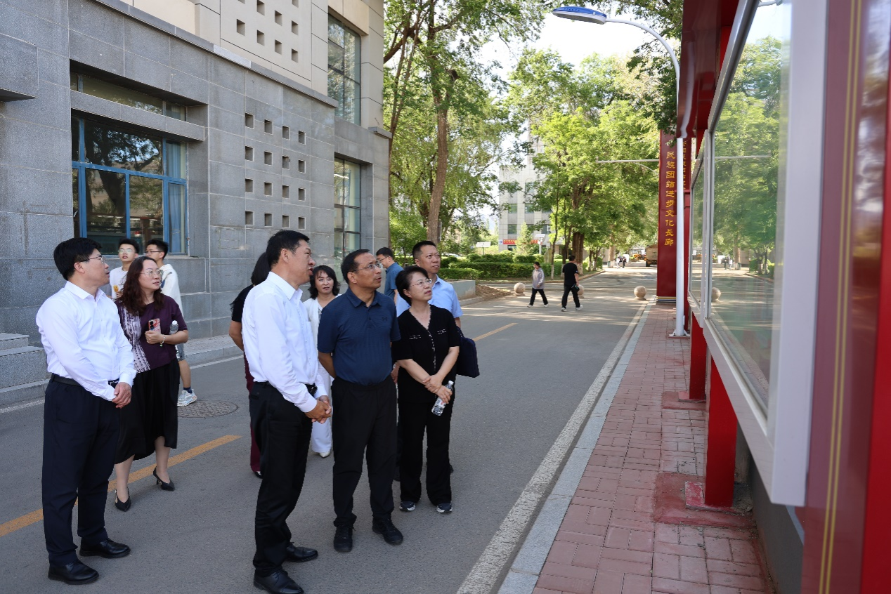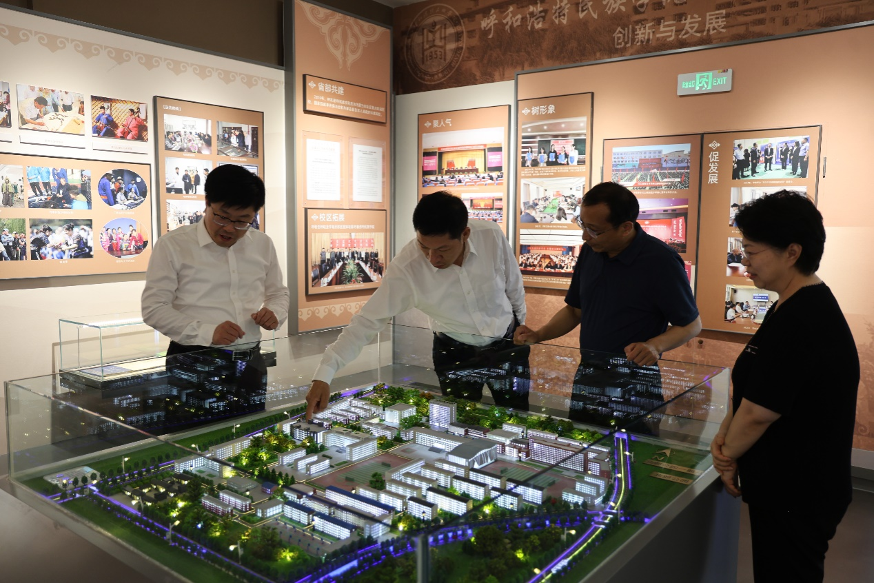 调研组一行考察了校史馆、铸牢中华民族共同体意识教育馆、民族团结进步文化长廊、时代楷模人物长廊,参观了美术学院2024届毕业生毕业作品展,“北疆记忆”非遗乐器展。