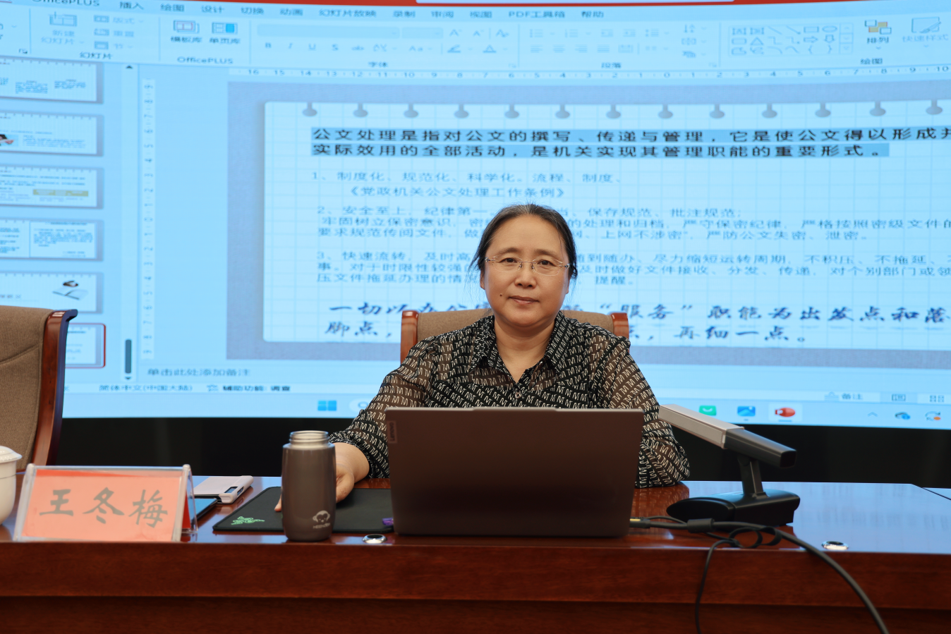 王冬梅以《公文写作与处理的基本技能》为题,从公文的概念、种类、格式规范、写作要求、一般步骤等方面,对公文写作的基本原则、行文规范、常见问题等进行了深入浅出的讲解,并结合多年公文写作经验,通过大量鲜活的案例,生动阐释了撰写高质量公文的基本方法。