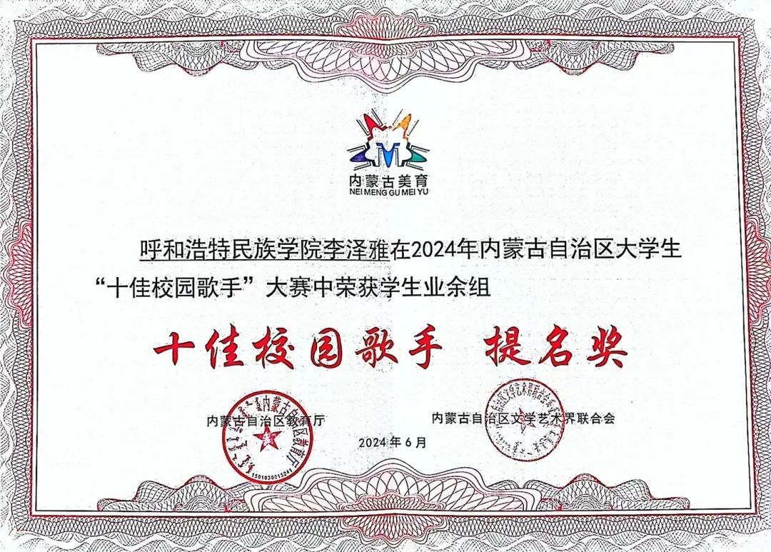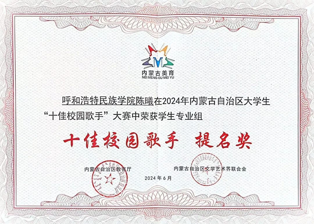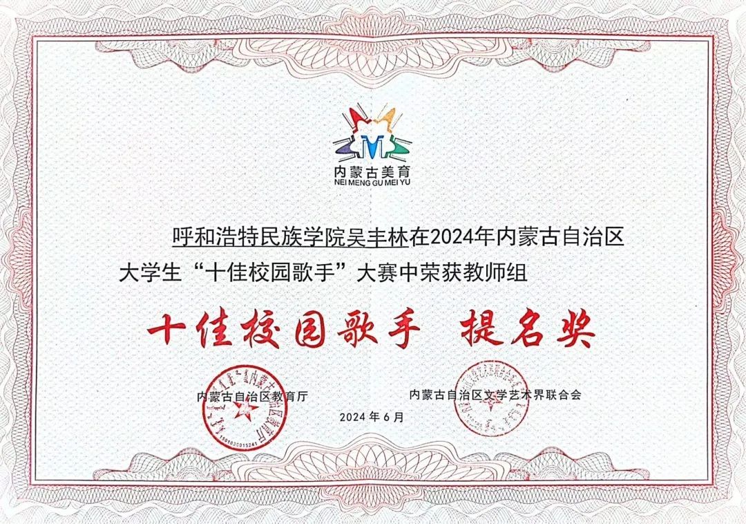 6月29日,由自治区教育厅联合自治区文学艺术界联合会主办的2024年内蒙古自治区大学生“十佳校园歌手”大赛展演暨颁奖仪式在呼和浩特职业学院成功举办。本届大赛共有来自全区57所高校1.2万余名师生参与其中。best365美术学院团总支负责人吴丰林荣获教师业余组“十佳校园歌手”提名奖;音乐学院学生陈曦荣获学生专业组提名奖;基础教育学院李泽雅荣获学生业余组提名奖。best365荣获2024年内蒙古自治区大学生“十佳校园歌手”大赛优秀组织奖。