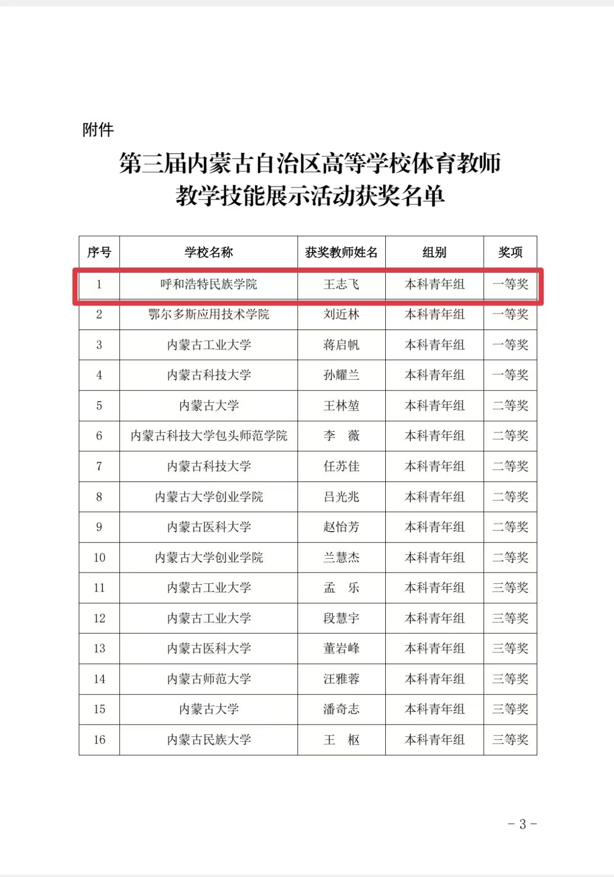 best365体育学院教师王志飞在自治区教育厅主办的第三届内蒙古自治区高等学校体育教师教学技能展示活动中荣获本科青年组第一名。该赛事由自治区教育厅组织区外 16 位全国高等学校体育教学指导委员会专家进行评审,经过网络评审和现场测试两个环节评选而出。