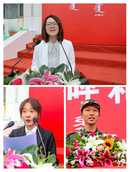 文学院院长高娃代表全体教师发言,她鼓励新生们树立理想明确奋斗目标、涵养人文情怀修身养性、积极参与实践活动自我发现,提升个人能力和创新精神,同时祝愿他们在大学生活中不断成长,实现个人梦想。外国语学院2021级英语2班董宇南同学鼓励新生们珍惜时光,勤奋学习,积极参与实践活动,勇敢面对未来的挑战,积极迎接不确定性,以实现无限的可能性。新闻传媒学院2024级播音与主持艺术班纳亚同学代表全体新生发言,表达了将军训中培养的纪律、团队精神和感恩意识应用到未来学习和生活中的坚定决心。