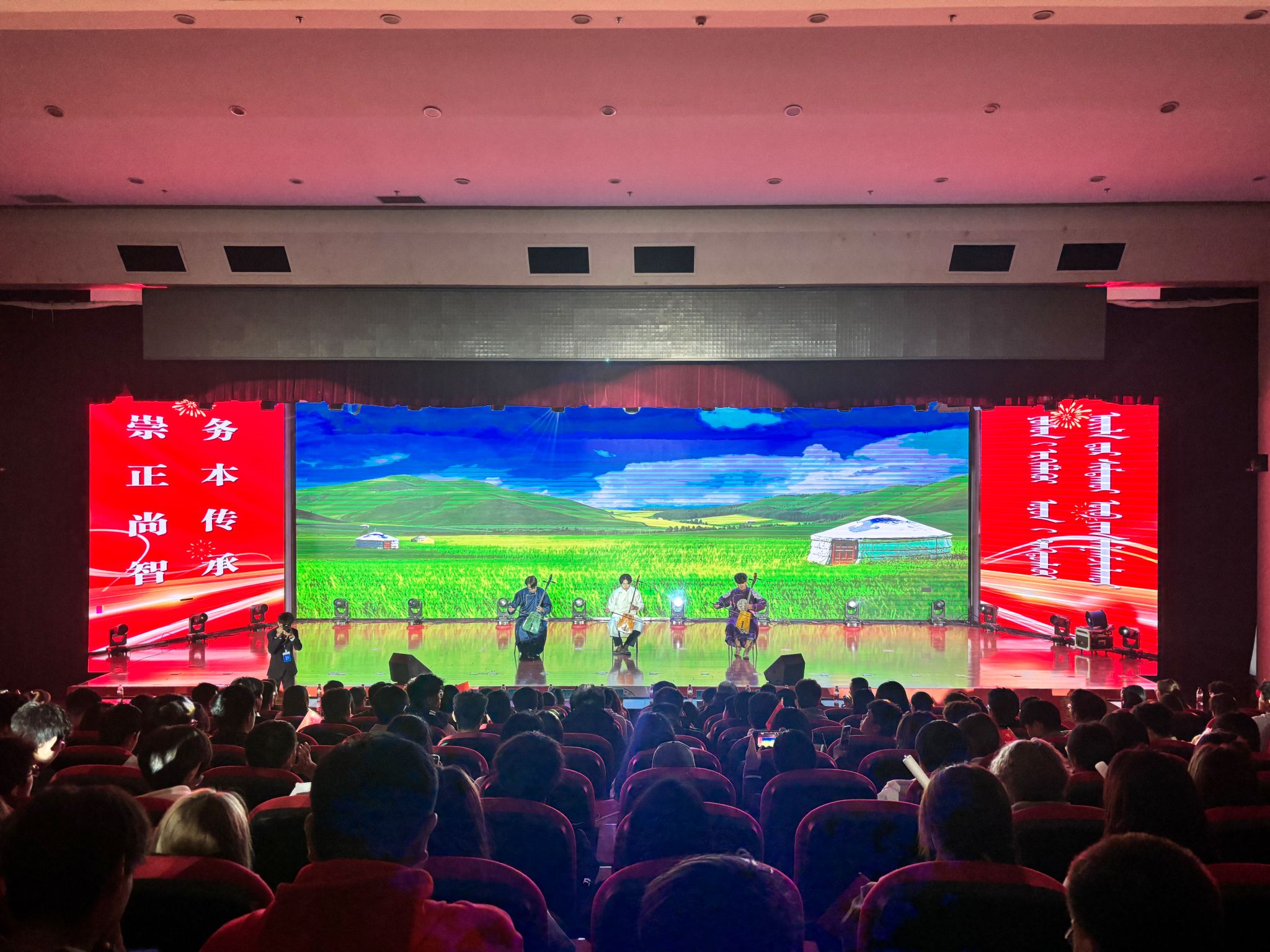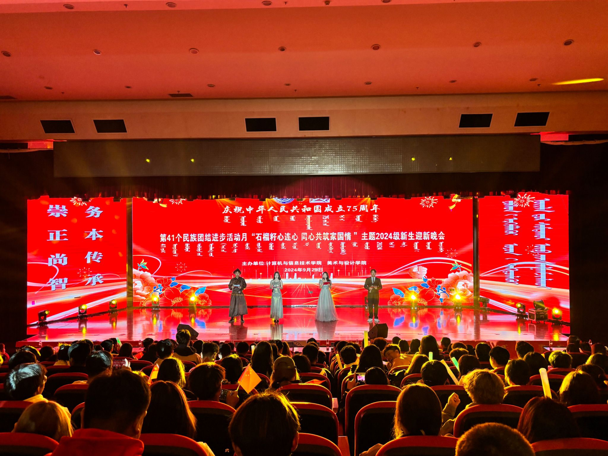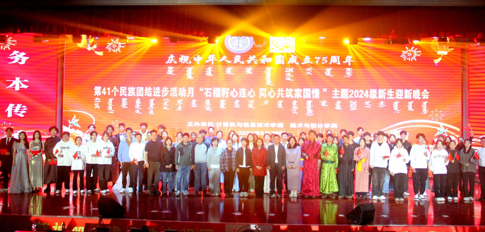 金秋送爽,丹桂飘香。为热烈庆祝中华人民共和国成立75周年,学校深入开展第41个民族团结进步月活动,9月29日,计算机与信息技术学院、美术与设计学院在北院图书馆二楼报告厅联合举办了“石榴籽心连心 同心共筑家国情”为主题的2024级新生迎新晚会。校党委委员、纪委书记、监察专员王冬梅,党委委员、统战部部长朝格吉乐图出席晚会。