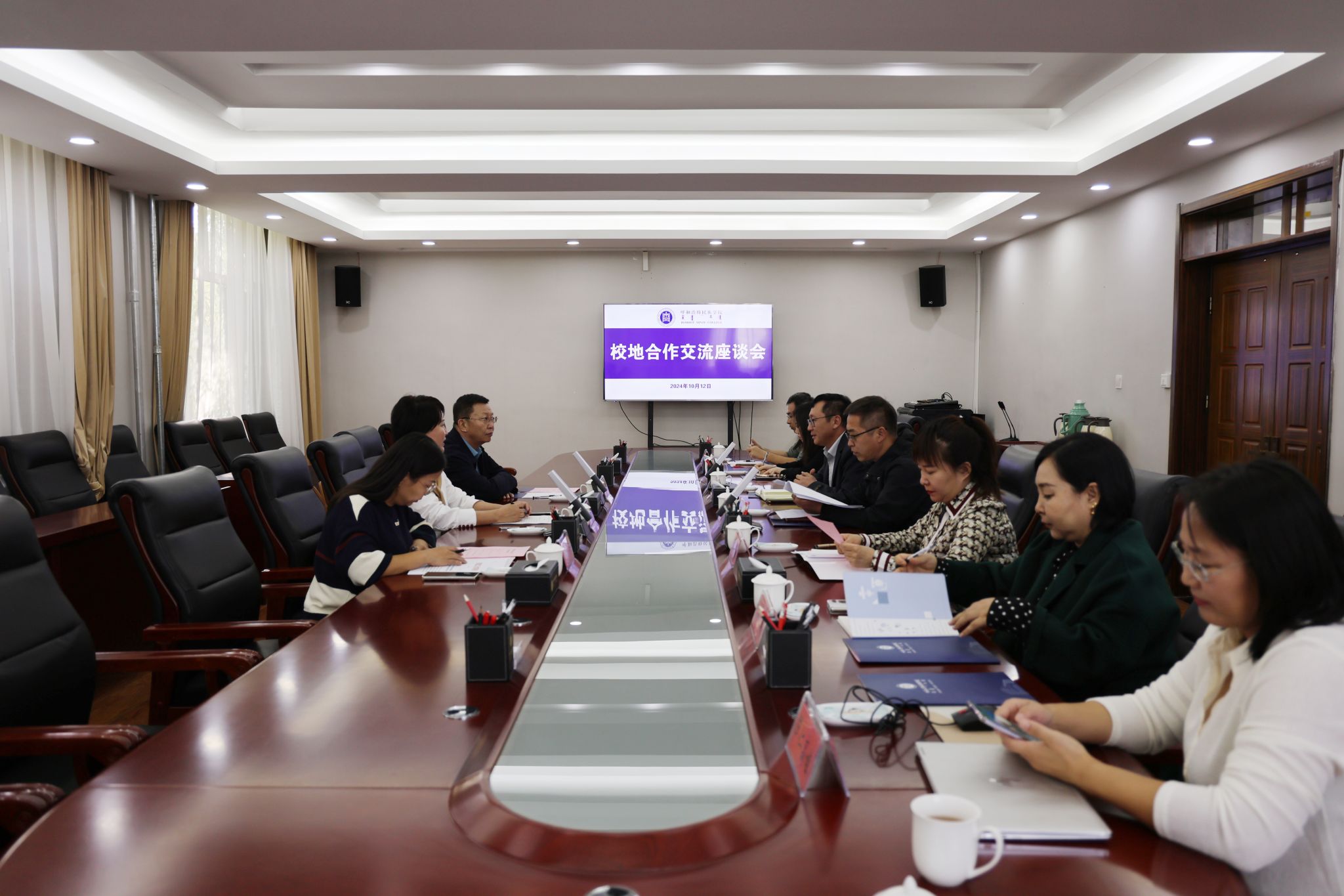 乌日娜首先通读了国家民委对乌拉特中旗文创产业发展的经验做法给予的批示通报。希望双方进一步深化扩大校地合作,实现更多的合作成果。随后,新闻传媒学院与会人员发言,分别从前期的经验做法、案例分析等方面,从学院和专业角度提出有效助力和提振地方社会经济文化发展的思路和对策,结合学生专业实践、劳动教育和实践教学的协作机制,达成校地协同育人、助力乡村振兴、促进全面合作的战略目标,真正做到传媒赋能、文化赋能、教育赋能,切实推进专业转型发展,有效培养传媒应用人才。