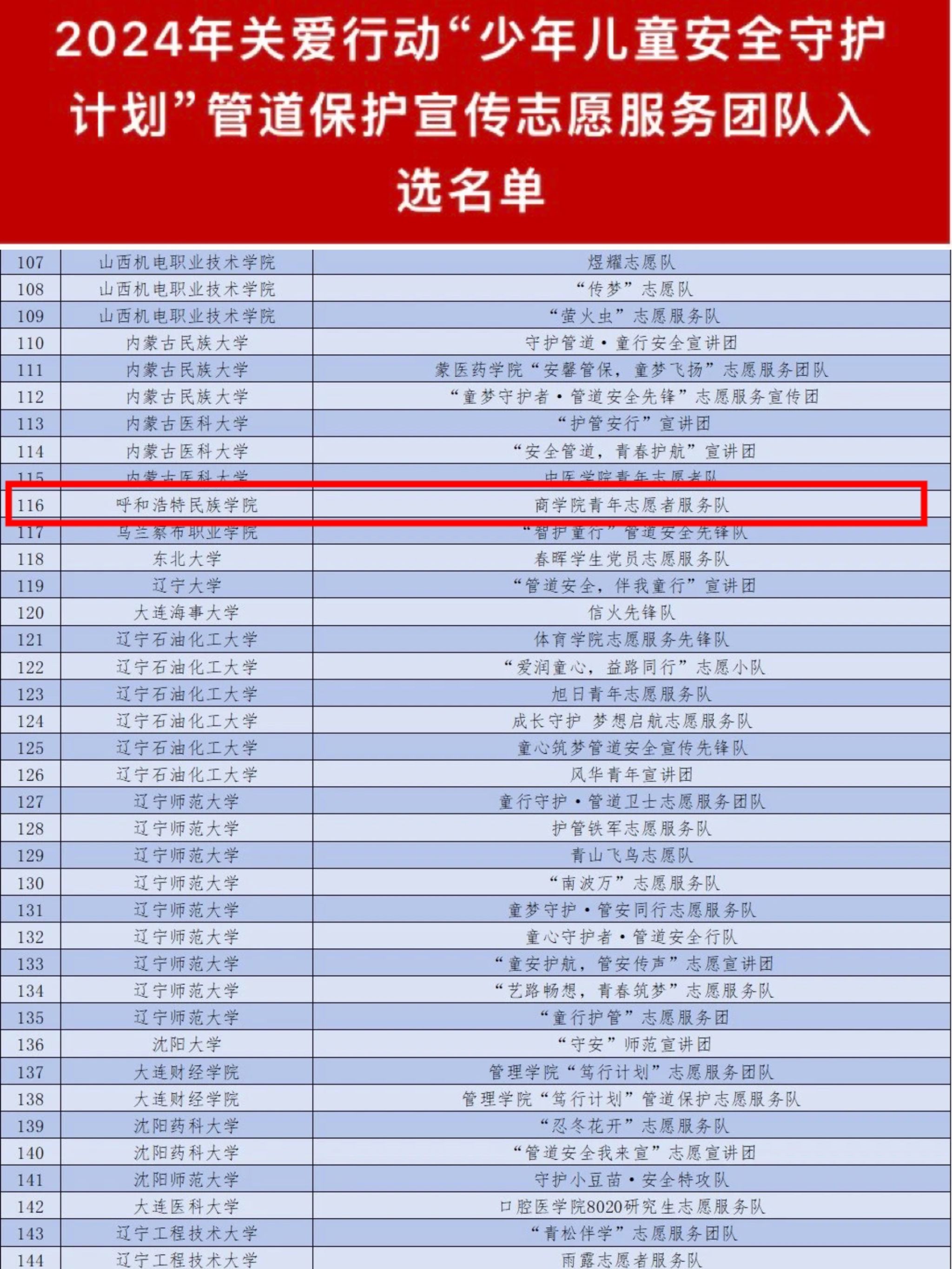 近日,团中央青年志愿者行动指导中心、中国少年儿童新闻出版总社有限公司联合国家石油天然气管网集团有限公司共同发布了《关于遴选2024年关爱行动“少年儿童安全守护计划”管道保护宣传志愿服务团队的公告》。best365商学院青年志愿者服务队等419所高校1000支志愿服务团队入选。