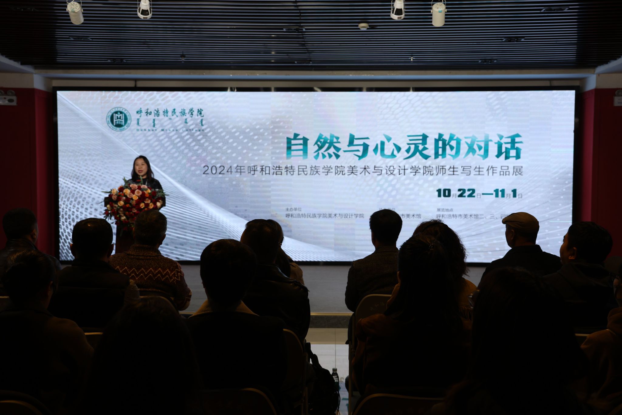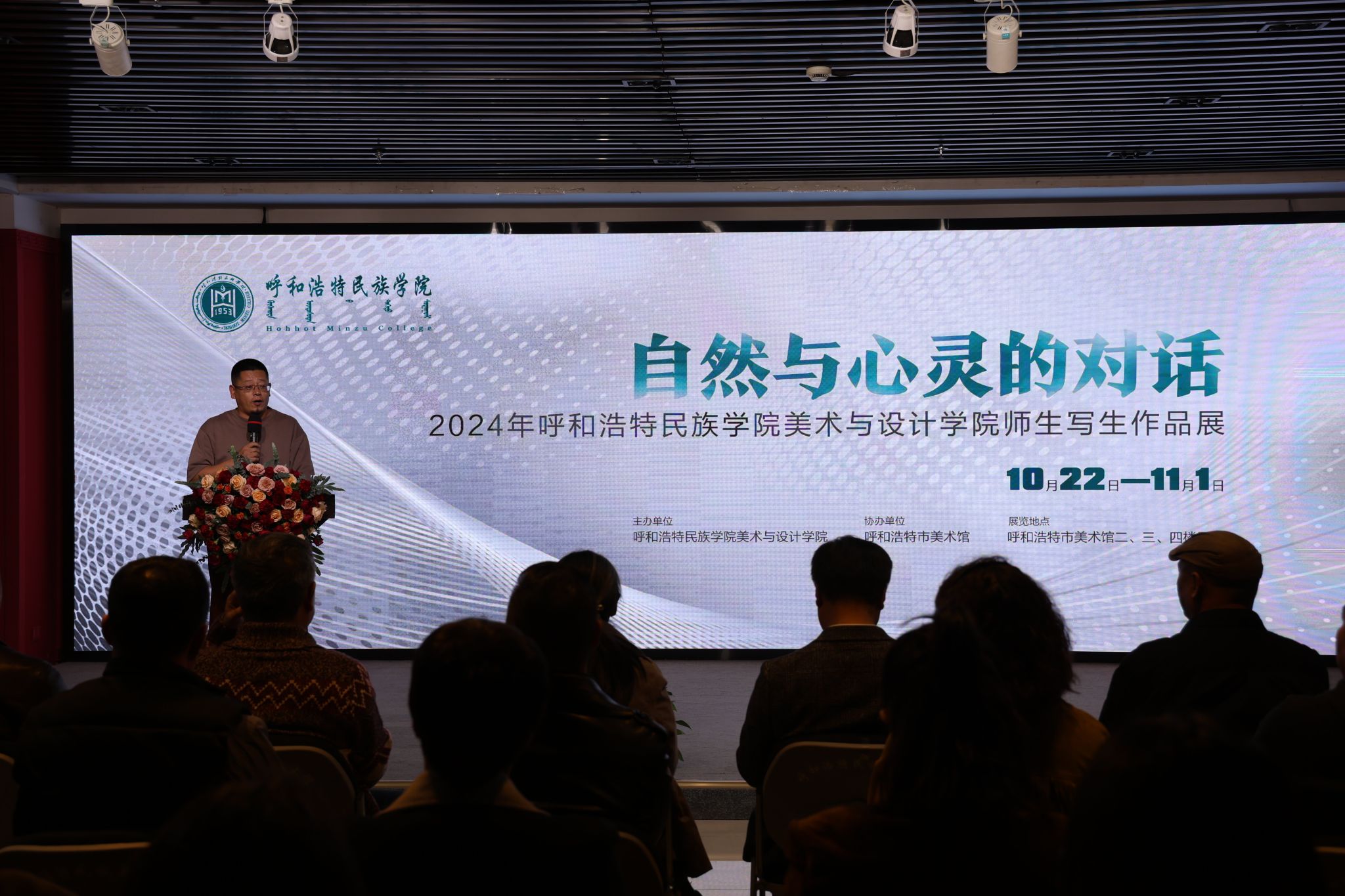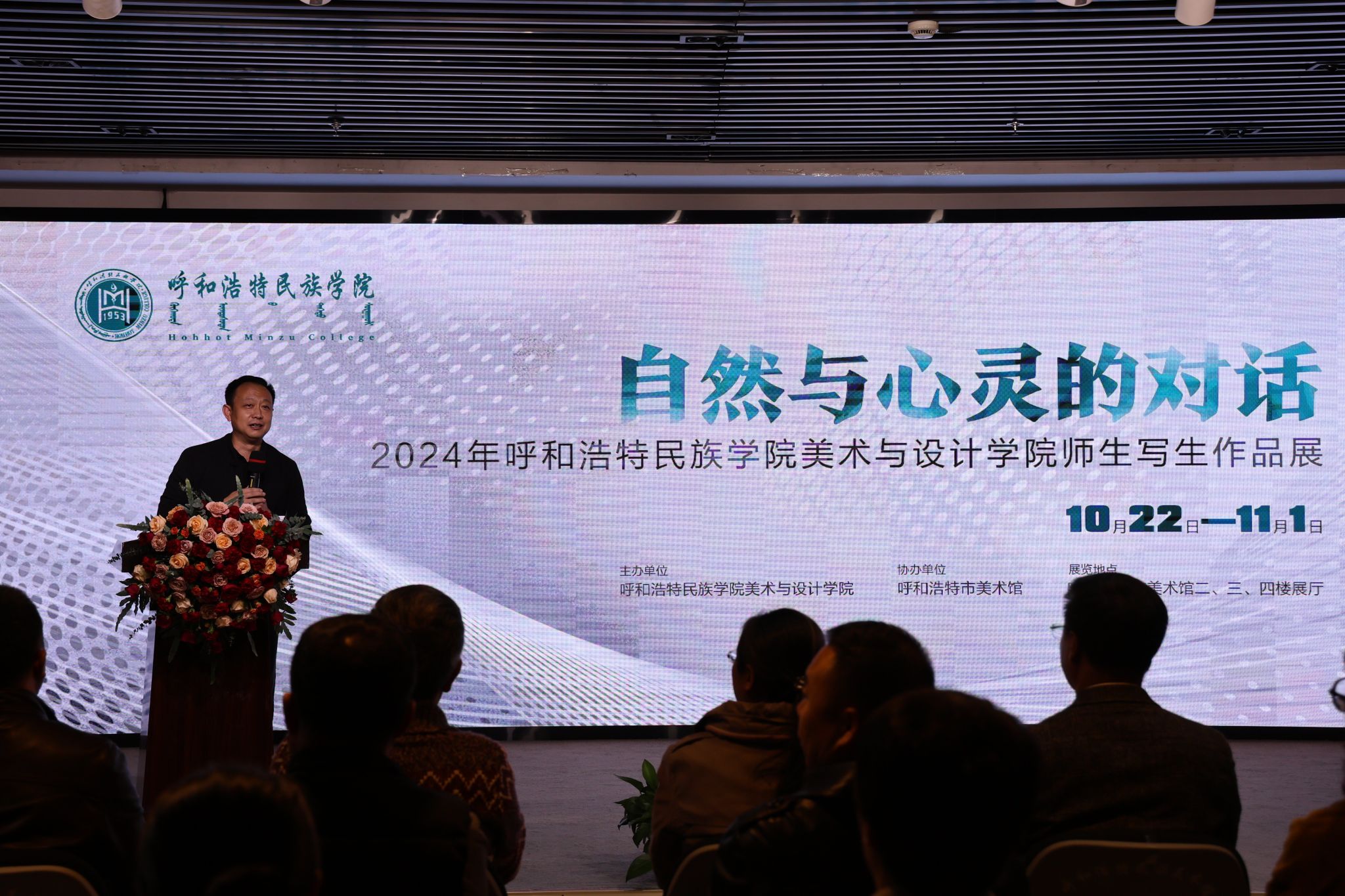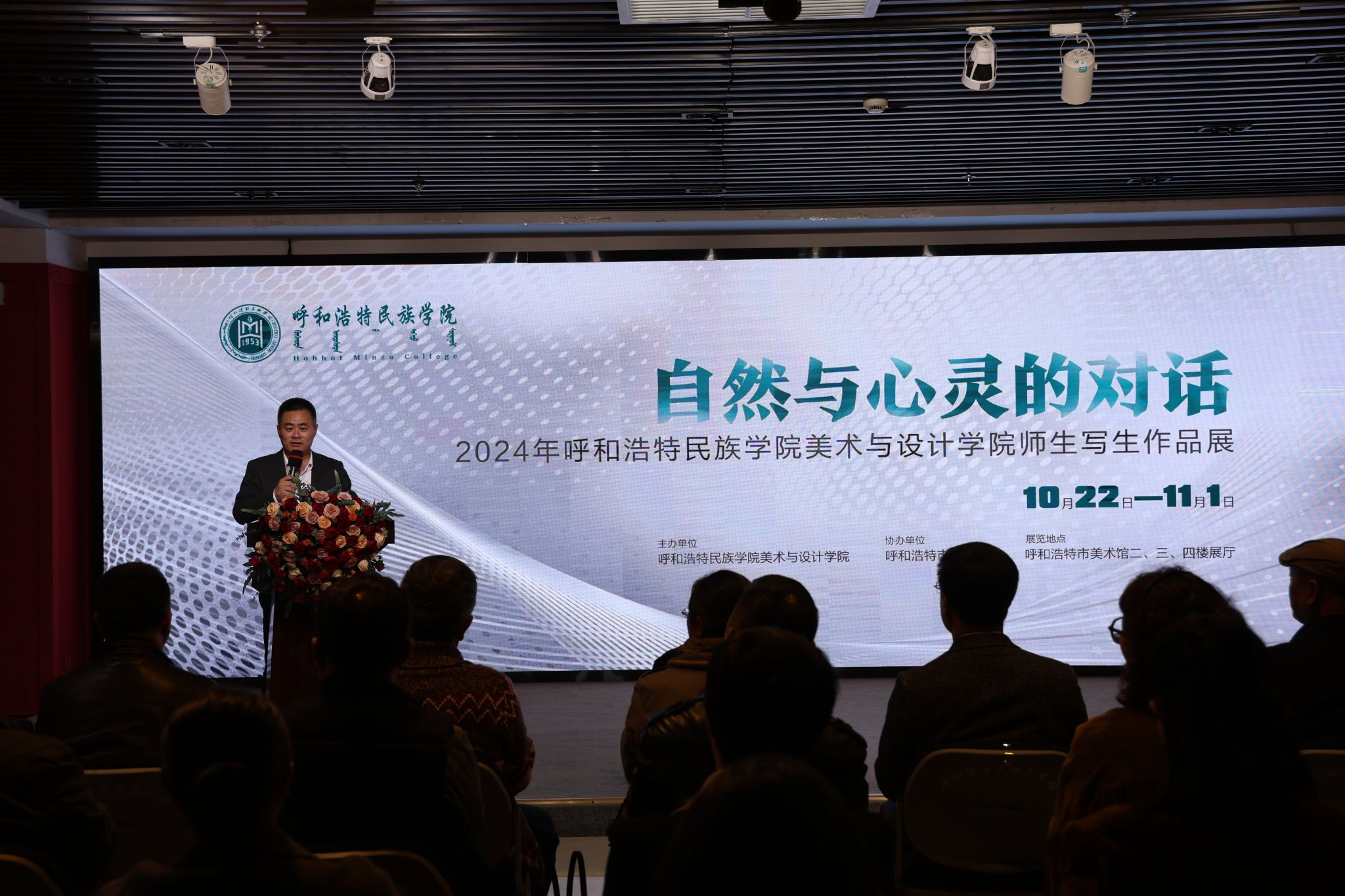 额尔敦布和在致辞中首先对呼和浩特市美术馆给予学校的大力支持表示感谢,并高度肯定赞扬了此次展览的艺术水准。他指出,写生创作是艺术教学的重要组成部分,是培养学生观察能力和创造力的有效途径。他希望美术与设计学院继续保持锐意进取的精神,深入推进教育教学改革,特别是在写生创作和艺术实践中,不断探索新的教学模式,激发学生的创造力和艺术潜力。他要求,美术与设计学院要始终坚守文化使命,注重培养学生的民族文化自信,为推动艺术教育事业的高质量发展做出更大贡献。