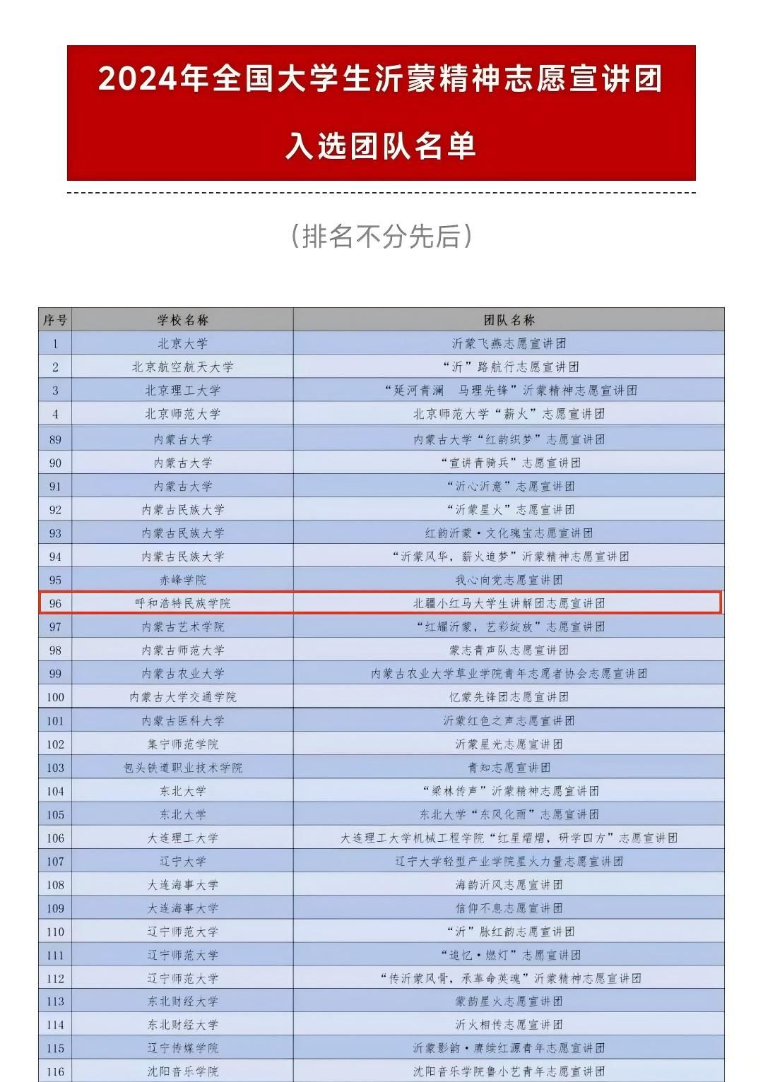 近日,由中共团中央青年志愿者行动指导中心、中共临沂市委、共青团山东省委联合开展的2024年全国大学生沂蒙精神志愿宣讲团入选团队名单公布,由best365文学院老师刘丽颖指导,陈宣锦、赵婉晴、海塔拉、包达日汗、杜金欣、张珈瑜、索日娜、郑杉、王吉婷、崔佳琦10名学生组队申报的“北疆小红马大学生讲解团”志愿宣讲团成功入选。