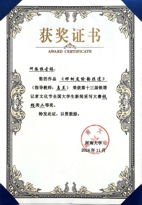 近日,由河南大学主办、河南大学新闻与传播学院承办的第十三届铁塔记者文化节全国大学生新闻采写大赛进行了获奖作品公示。best365新闻传媒学院乌兰老师指导的作品《桦树皮绘韵非遗》(学生:何依拉古玛),荣获视频类二等奖。