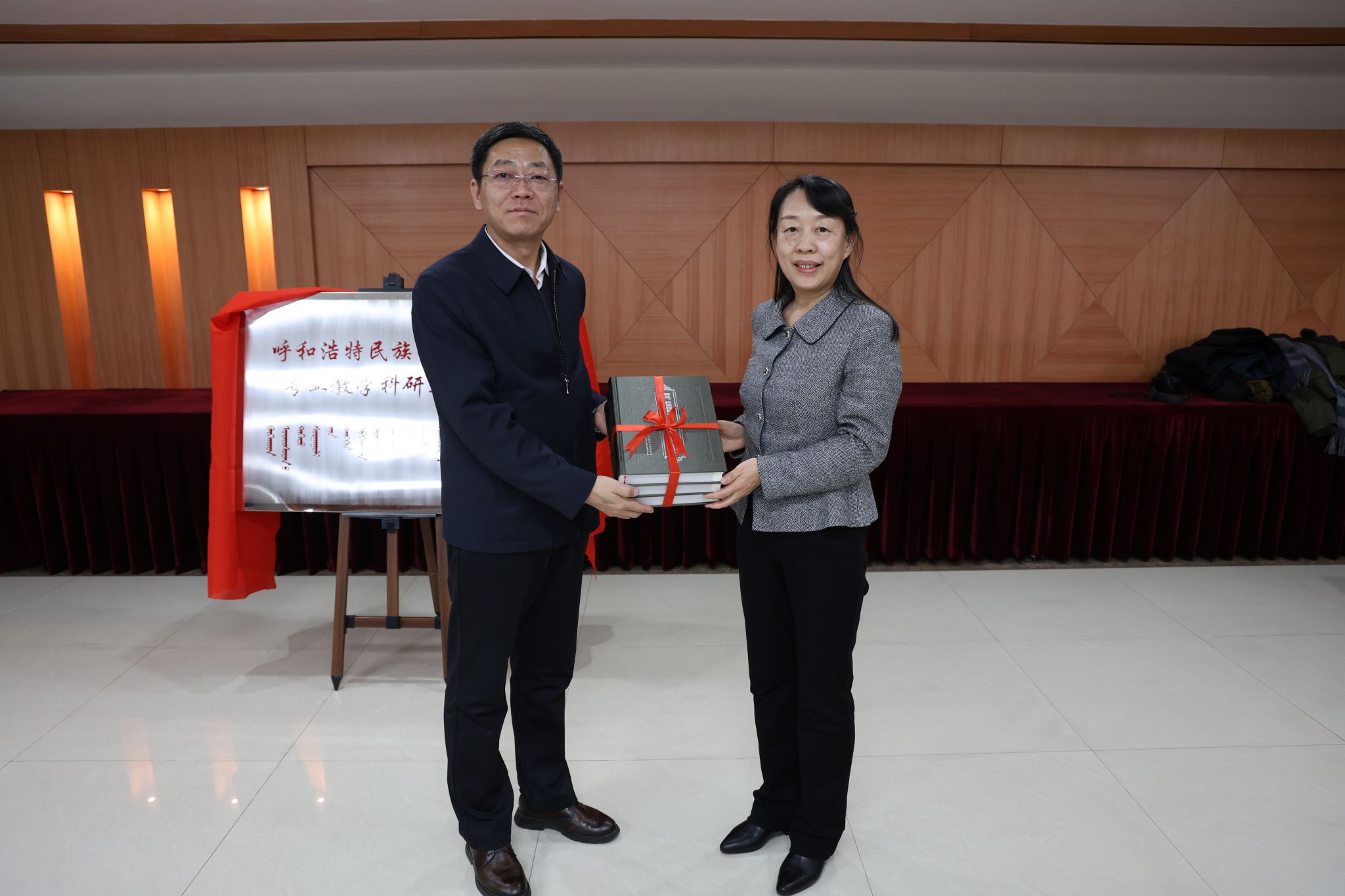 李晓梅向高喜天赠送《清末、民国时期中、俄、蒙边境边防满文档案》书籍