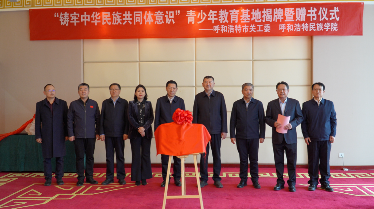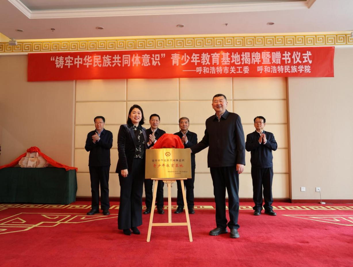 刚布和、格根哈斯共同为“铸牢中华民族共同体意识”青少年教育基地揭牌,格日乐图代表关工委向学校赠送了《关爱成长 书香守望》书籍,刘瑞鸿接受了赠书。