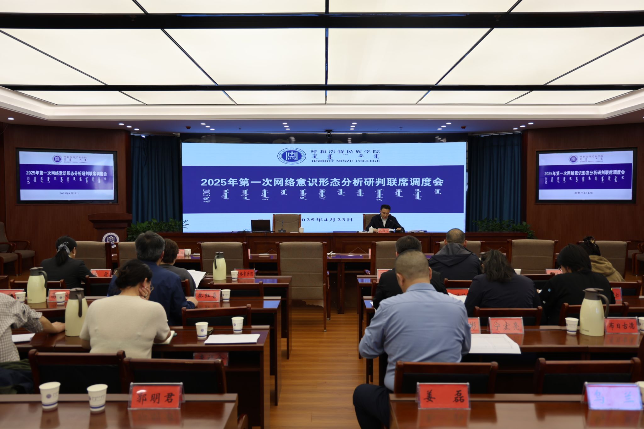 4月23日下午,学校在综合楼12楼会议室召开网络意识形态分析研判联席会。各部门负责人、各学院党总支书记、党委宣传部全体人员参会。
