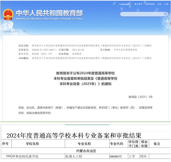 4月22日,教育部正式发布《关于公布2024年度普通高等学校本科专业备案和审批结果及〈普通高等学校本科专业目录(2025年)〉的通知》(教高函〔2025〕3号),best365申报的“机器人工程”专业成功获批。