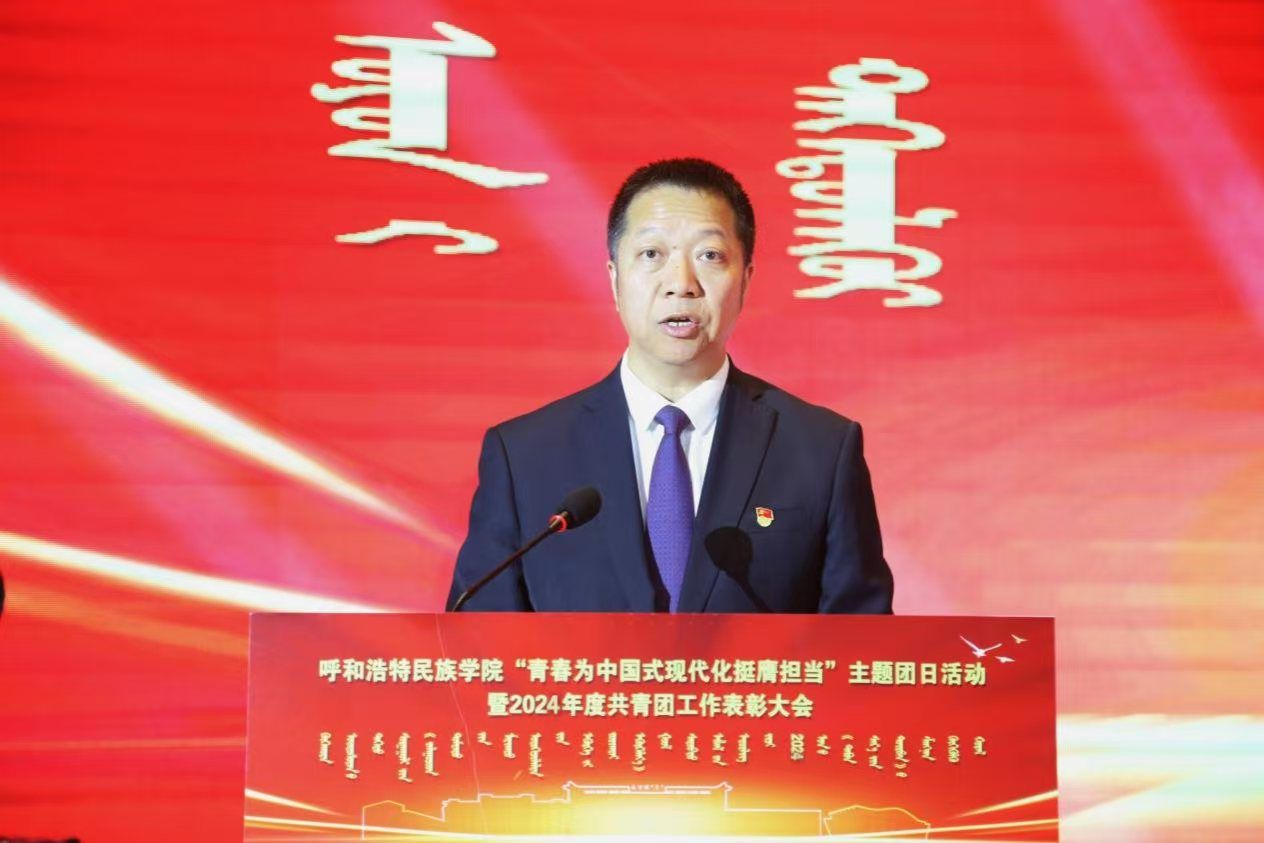 双虎在寄语中充分肯定了全校各级团组织过去一年取得的成绩,并激励青年学生,一是要立大志、明方向,让信仰之光照亮青春征途。要始终以党的旗帜为旗帜、以党的方向为方向,把听党话、跟党走的坚定信念融入血脉,在“青年大学习”中深学细悟党的创新理论,在“行走的思政课”上触摸时代脉搏。二是要敢担当、善作为,让奋斗之姿彰显青春价值。要俯下身子夯实“地面”的根基,在解决“急难愁盼”中成长,在服务“国之大者”中绽放自我。三是要勇开拓、勤磨砺,让实干之力书写青春华章。要以“强国有我”的使命担当,把个人理想融入祖国北疆发展大局,用脚步丈量责任,用奋斗定义青春,在中国式现代化的生动实践中书写属于“呼民院”青年的壮美篇章。