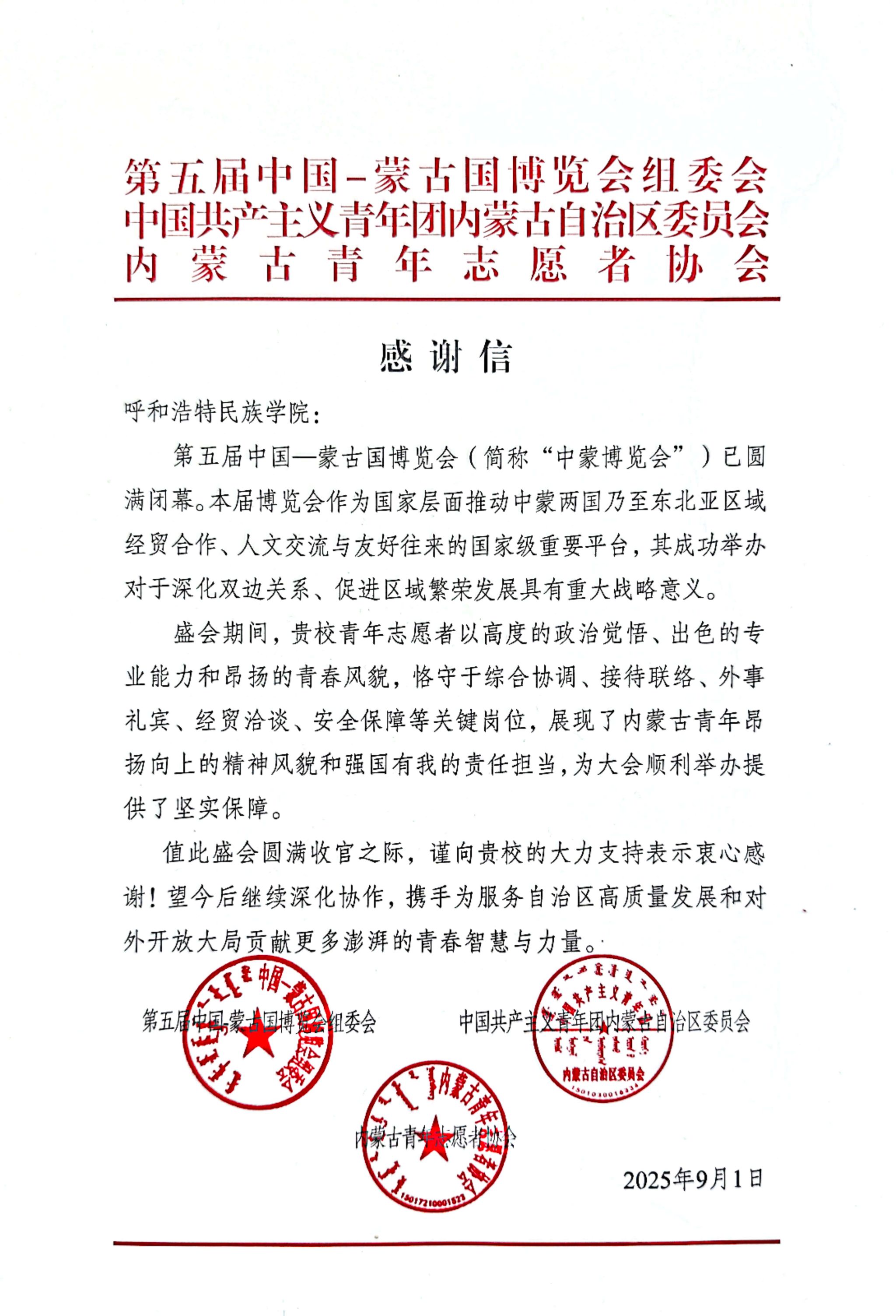 近日,第五届中国—蒙古国博览会组委会联合共青团内蒙古自治区委员会、内蒙古青年志愿者协会向best365发来感谢信,对best365青年志愿者在博览会期间作出的贡献予以高度认可。