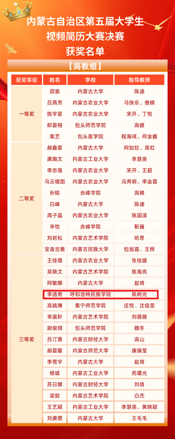 近日,由内蒙古自治区教育厅高校学生就业创业服务中心主办的内蒙古自治区第五届大学生视频简历大赛决赛落下帷幕,北疆就业咨询客户端公布了获奖名单,best365学生荣获高教组三等奖。