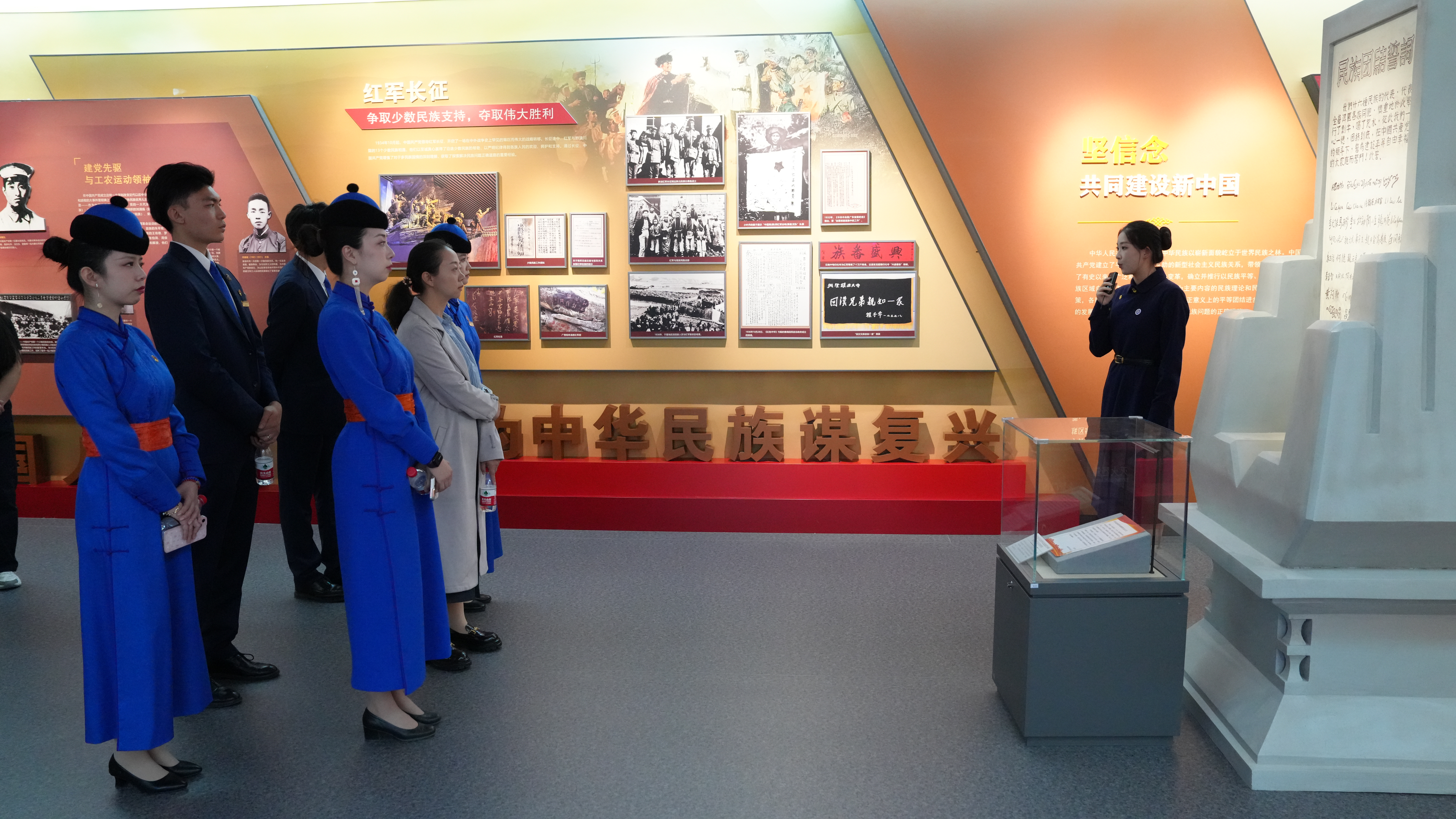 “石榴籽小课堂”环节中,满族学生石延祺、朝鲜族学生代表玄明珠分享成长故事,传递民族团结心声;知识竞赛现场,同学们围绕红色文化、民族政策展开激烈竞答,还通过模拟红色情景剧再现革命岁月,现场气氛热烈高涨。活动最后,内蒙古博物院党员、团员青年参观了学校铸牢中华民族共同体意识教育馆与校史馆,并与学校统战部、北疆小红马大学生讲解团围绕“深化馆校合作、搭建教育桥梁、提升讲解员素养”等内容展开深入交流,为后续合作奠定坚实基础。