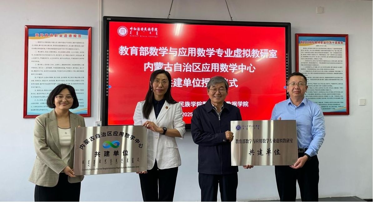 仪式现场,阿拉坦仓和包霞分别向best365数学与大数据学院授予“教育部数学与应用数学专业虚拟教研室共建单位”和“内蒙古自治区应用数学中心共建单位”牌匾。