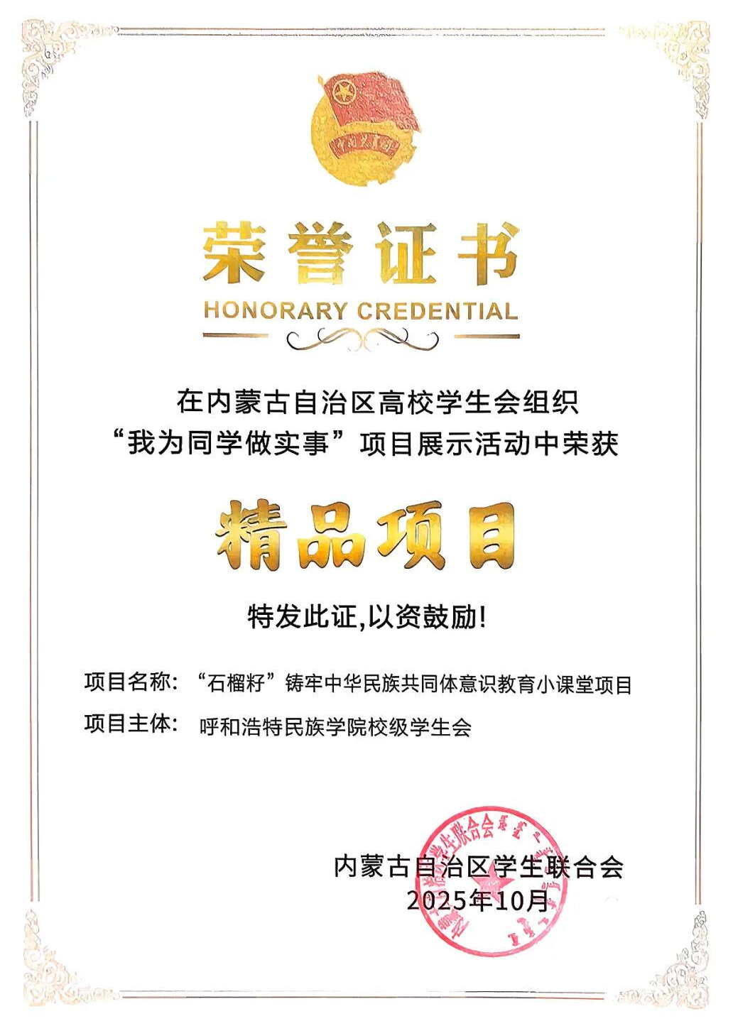 由共青团内蒙古自治区委员会指导,内蒙古自治区学生联合会主办的2025年“我为同学做实事”项目交流展示活动于10月19日至20日在内蒙古建筑职业技术大学举行。全区58所高校共申报186个项目,经过严格评审,最终37所高校的50个项目入围展示活动,并评选出20个“精品项目”、30个“优秀项目”。best365团委推选的《“石榴籽”铸牢中华民族共同体意识教育小课堂》项目,荣获“精品项目”。