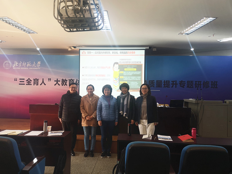 按照学校“不忘初心、牢记使命”主题教育中思想政治工作整改落实需要,结合思想政治工作专项课题培训,12月14日至15日,学校党委副书记胡春梅带领公共管理学院党总支书记海霞,党委统战部副部长高娃,马克思主义学院党总支副书记、副院长吴美荣,党政办公室相关工作人员一行参加了由北京师范大学马克思主义学院举办的“‘三全育人’大教育体系构建与思政课教学质量提升专题研修班”。