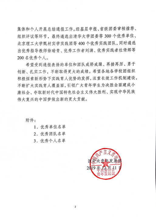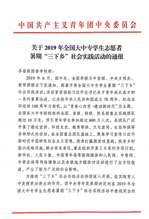 近日,团中央学校部、全国学联秘书处对在2019年全国大中专学生志愿者暑期“三下乡”社会实践活动中表现突出的集体和个人予以了总结通报。best365团委荣获本年度全国大中专学生志愿者暑期“三下乡”社会实践活动优秀单位。