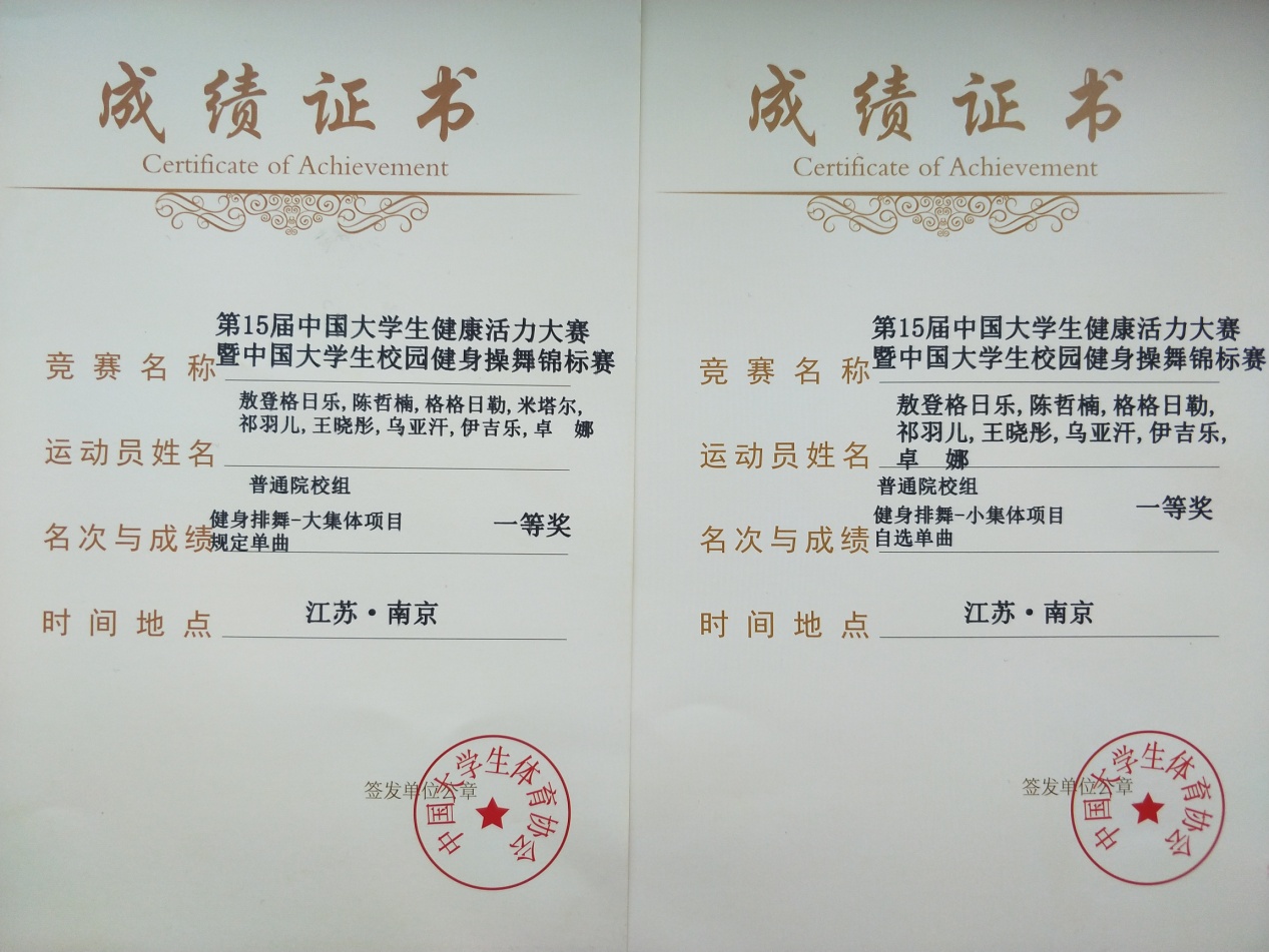 在此次比赛中,best365代表队努力拼搏、开拓创新,用具有民族特色的舞姿赢得了全场观众和评委们的一致好评,最终获得了普通院校组健身排舞大集体项目规定单曲一等奖,小集体项目自选单曲一等奖,三人荣获三等奖的好成绩。在全国性大赛中,为学校又一次争得了荣誉。