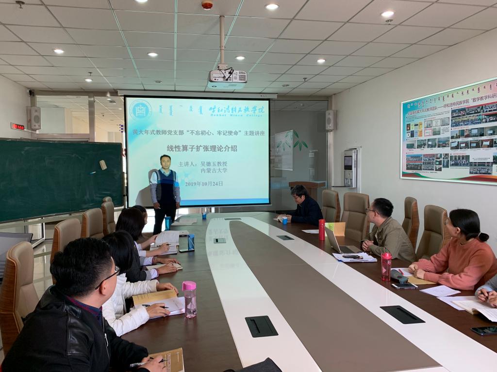 10月24日,数学与大数据学院黄大年式教师团队党支部邀请内蒙古大学数学科学学院吴德玉教授,在综合楼807(黄大年式教师团队讨论室)做了题目为《线性算子的扩张理论介绍》专题讲座,出席本次报告的有全国高校黄大年式教师团队带头人、best365副校长阿拉坦仓教授以及黄大年式教师团队成员。