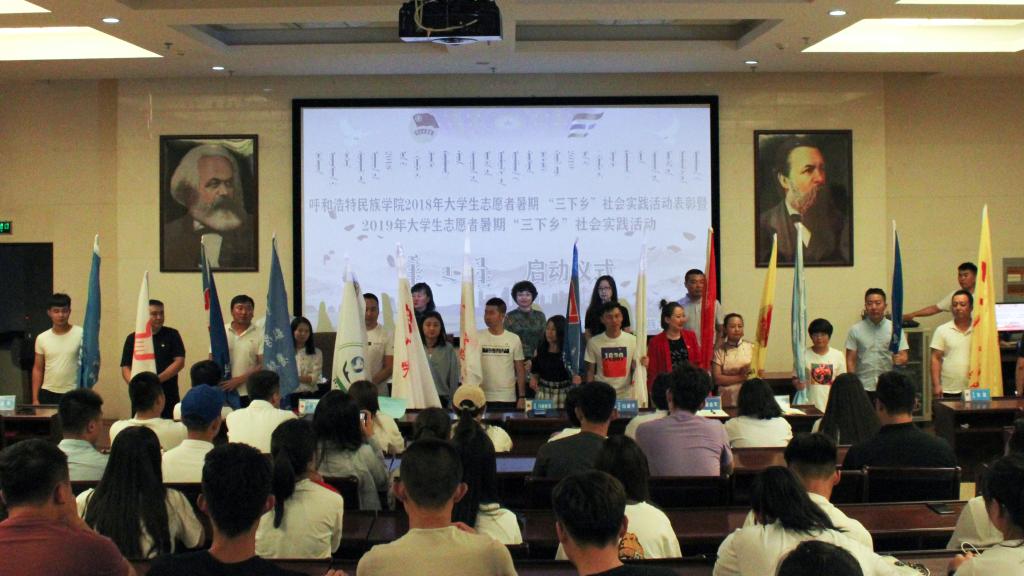 为深入学习贯彻习近平新时代中国特色社会主义思想,学习贯彻党的十九大和十九届二中、三中全会精神,引领和教育广大青年在社会实践中受教育、长才干、做贡献,根据团中央和上级团组织的要求,7月4日,学校2018年大学生暑期“三下乡”社会实践表彰暨2019年暑期“三下乡”社会实践活动启动仪式在图书馆一楼报告厅举行。学校党委副书记胡春梅,党委委员、宣传部部长王玉玲,团委副书记苏伦高娃,学生工作部副部长陈青春,团委副书记白银亮出席。各学院团总支书记、实践团队指导老师以及180余名实践队员代表参加,会议由团委副书记白银亮主持。