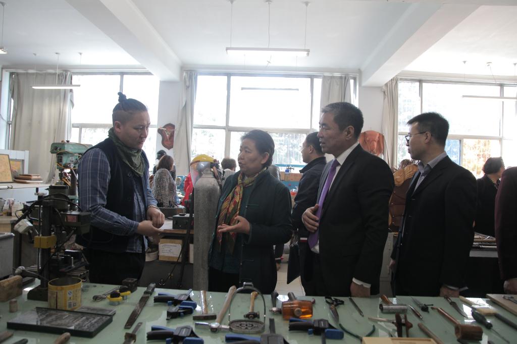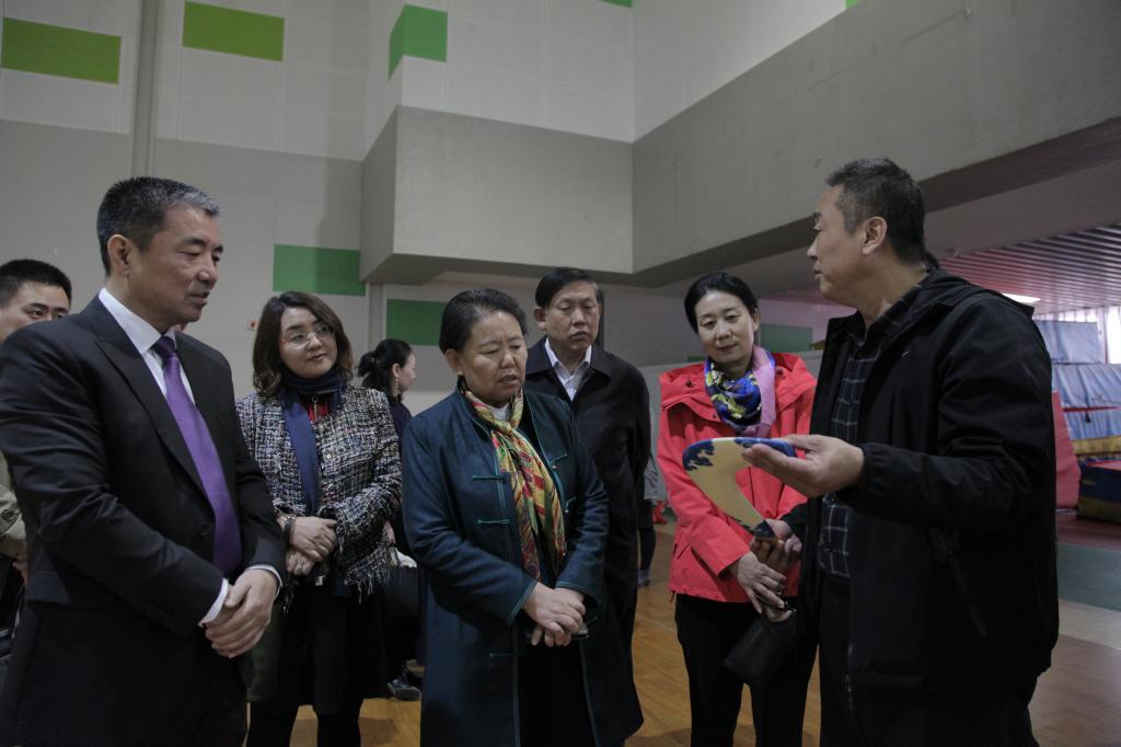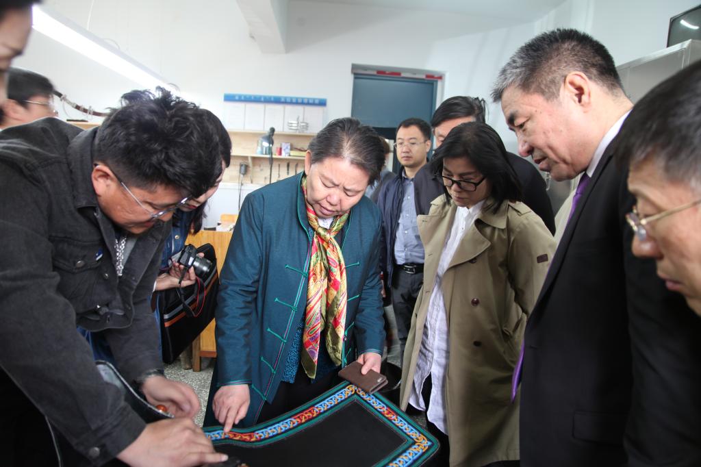 调研组在学校党委副书记、校长格日乐图,党委副书记胡春梅,党委委员、副校长阿拉坦仓及相关部门、院系负责同志的陪同下,先后到民族服装与服饰设计专业实验室、皮艺实验室、产品设计实验室进行实地调研,并在体育馆观摩了民族传统体育项目。