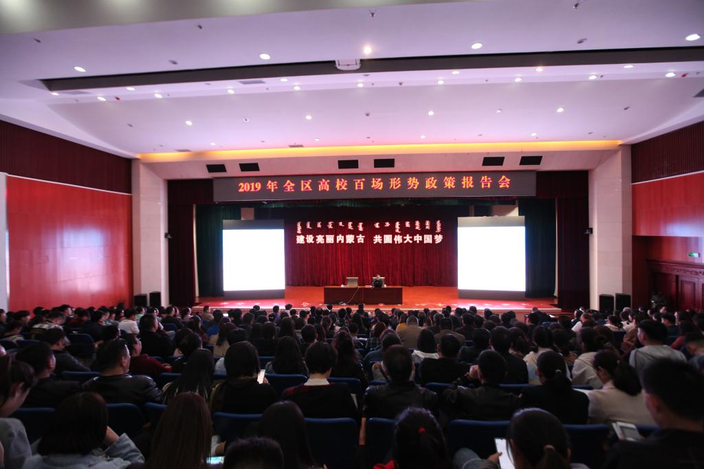 为深入学习贯彻习近平新时代中国特色社会主义思想,深刻贯彻落实习近平总书记对内蒙古的重要指示精神和全国两会精神,按照自治区党委宣传部关于在全校开展百场形势政策报告会的要求,结合学校党委中心组扩大学习、意识形态工作专题培训等有关工作安排部署,4月12日下午,best365在图书馆二楼报告厅举办2019年首场形势政策报告会。报告会邀请自治区社科联党组成员、副主席胡益华作了题为《当前意识形态领域面临的风险挑战及对策》的报告。党委中心组全体成员、副科级以上干部、辅导员、部分任课教师、学生干部共600余人聆听报告。报告会由党委副书记胡春梅主持。