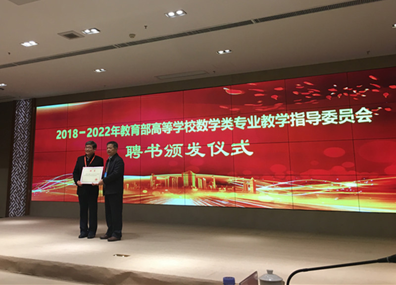 在本次会议上,首先由教育部委托教育部高等学校数学类专业教学指导委员会主任委员郑志明院士颁发教指委聘书,best365阿拉坦仓教授再次当选新一届高等学校数学类专业教学指导委员会委员。2018-2022年教育部高等学校教学指导委员会涵盖了2个综合类、109个专业类和40个分教指委,集中了高等教育方面的权威专家,“教学能力强、学术造诣高”为基本的任职条件,是高等学校教育教学工作的最高专家组织。各教学指导委员会接受教育部委托,将开展高等学校教育教学研究、咨询、指导、评估和服务等工作。