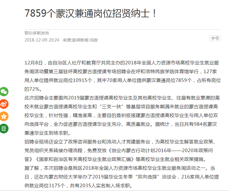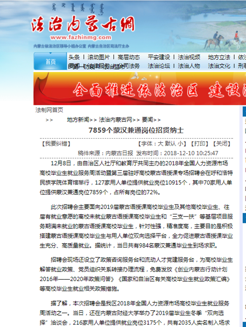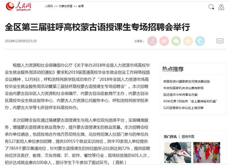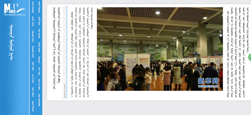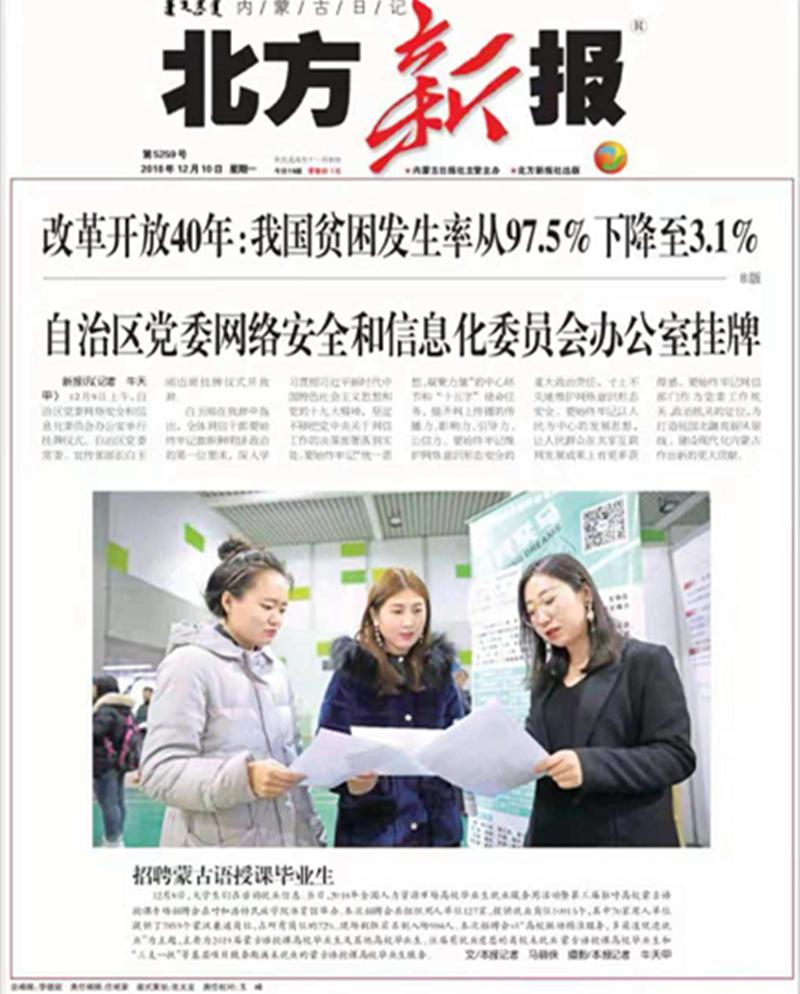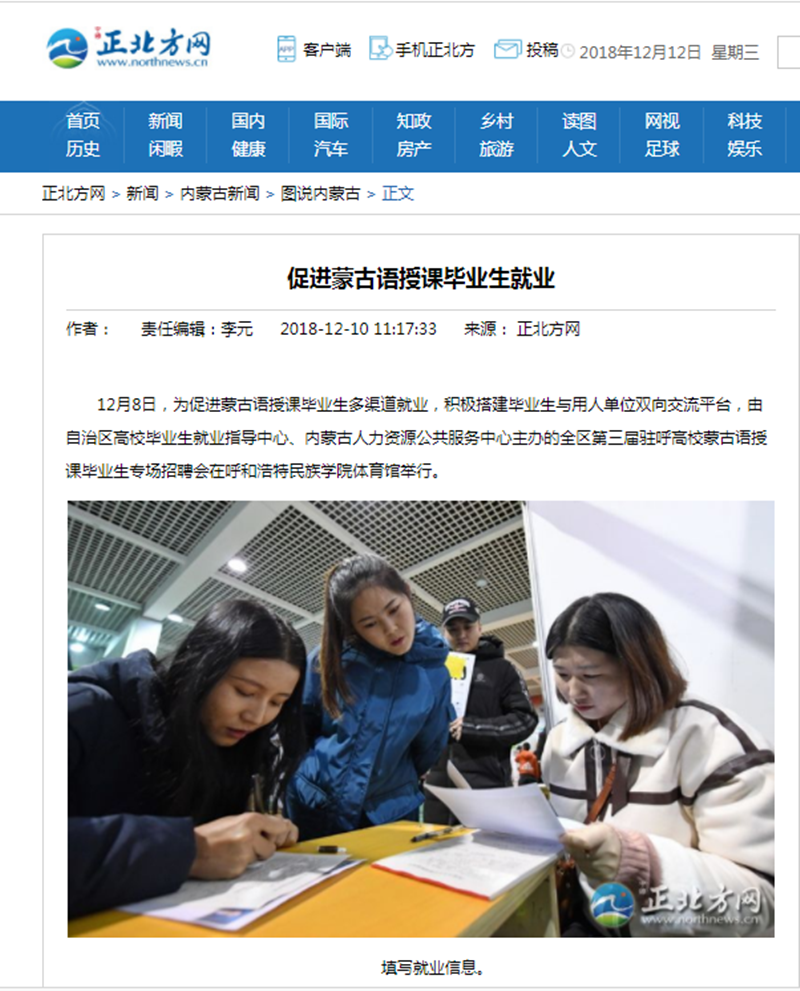 12月8日,第三届驻呼高校蒙古语授课生专场招聘会在best365举行。连日来,《北方新报》、《呼和浩特日报》、人民网、新华网(蒙文)、内蒙古客户端、中国新闻网、北疆大学生等主流媒体对活动进行了跟踪报道。新浪网、澎湃网、内蒙古法制网等6家媒体进行了转载报道。通过媒体的广泛关注,进一步扩大了best365的知名度、美誉度,有力地推进了蒙古语授课毕业生就业择业工作。