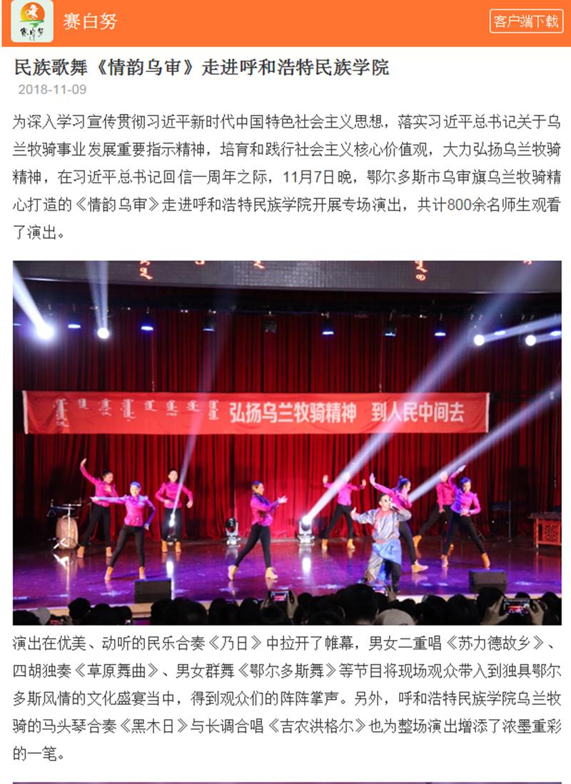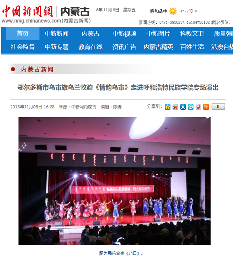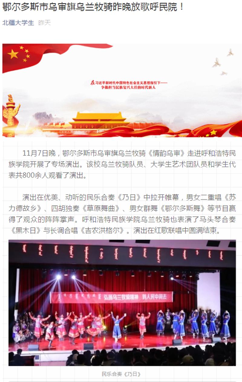 11月7日,鄂尔多斯市乌审旗乌兰牧骑《情韵乌审》来best365开展专场演出。本场演出体现出浓郁的鄂尔多斯风情和鲜明的乌兰牧骑特色,具有艺术性和观赏性,受到现场师生的喜爱。 中国新闻网、呼和浩特新闻网、北疆大学生、内蒙古旅游融媒体对活动进行了专题报道。