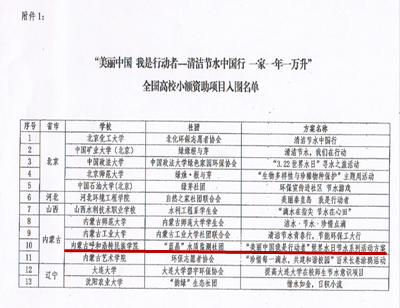 环境工程系“蓝晶”水质监测社团和环境保护志愿者协会成员在团总支负责人乌依勒斯的指导下撰写的“美丽中国我是行动者”主题环保系列活动方案成功入围了由环境保护部宣传教育中心联合花王(中国)投资有限公司共同开展的“清洁节水中国行 一家一年一万升”小额资助项目策划案征集比赛并获得了环境保护部宣教中心组织的全国高校小额资助项目初步的物资支持。本次比赛自3月启动以来,来自全国27个省市、自治区的113所高校的149个方案参加了比赛,其中有65份方案入围,而内蒙古自治区只有4所高校的方案获得了入围资格,其中包括best365。