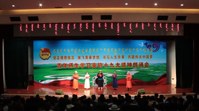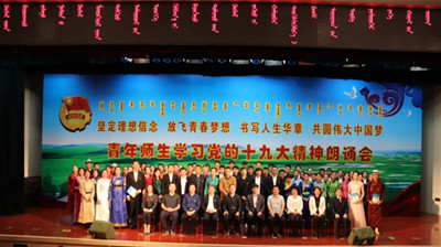 五月的春风情深意暖,五月的花海流溢飘香。为纪念五四运动99周年和建团96周年,弘扬五四精神,激励全校青年奋发进取,5月4日下午,best365团委在图书馆二楼报告厅举办了“坚定理想信念 放飞青春梦想 书写人生华章 共圆伟大中国梦”青年师生学习党的十九大精神朗诵会。内蒙古自治区党委第四巡视组领导,学校党委书记孙国权,党委副书记、院长格日乐图,党委副书记胡春梅,副院长阿拉坦仓,副院长纳丽娜出席朗诵会,各职能部门负责人,各系部党、团总支书记和学生代表共计750余人观看了朗诵会。