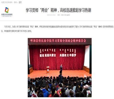人民网、中国新闻网、《内蒙古日报》(蒙、汉文版)、新华网蒙古文网、内蒙古融媒体、呼和浩特新闻网、内蒙古广播电台蒙古文频道、呼和浩特新闻广播电台、大学生手机报等媒体对形势政策报告会进行了报道,正北方新闻网、内蒙古综合新闻网等媒体进行了转载报道。
