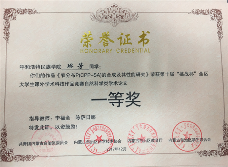 近日,第十届“挑战杯”全区大学生课外学术科技作品竞赛成绩揭晓。学校选送的27件作品,经过初审、复审和终审问辩等环节,共有7件作品获奖,其中best365学生琳芳的作品《窄分布P(CPP-SA)的合成及其性能研究》荣获一等奖,6件作品荣获三等奖。