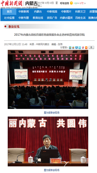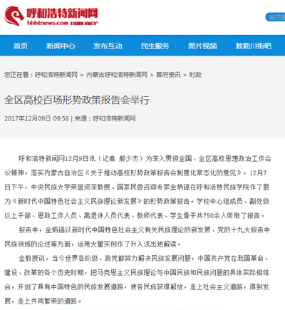 12月7日下午,中央民族大学金炳镐教授应邀来best365作形势政策报告,这是best365“2017年全区高校百场形势政策报告会”系列活动之一。经宣传部向媒体推荐,《内蒙古日报》(蒙文版)、中国新闻网、呼和浩特新闻网、呼和浩特新闻综合广播对此次活动进行了报道,并有其他媒体进行转载报道。