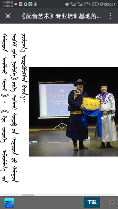 随后,内蒙古配音艺术协会向best365传媒系颁发了“配音艺术专业培训基地”牌匾。据此,best365传媒系成为全区乃至全国范围内第一个蒙古语影视配音艺术专业培训基地。