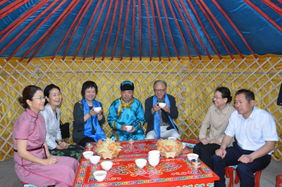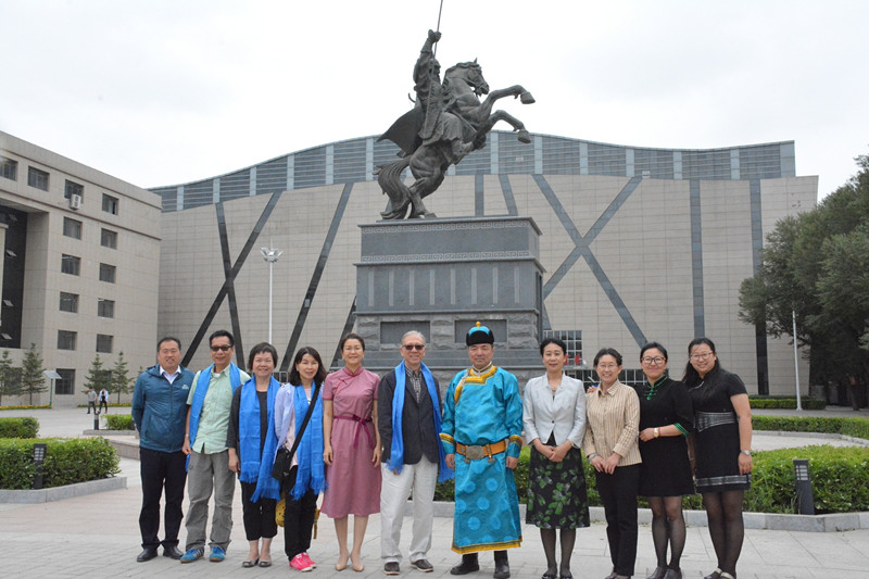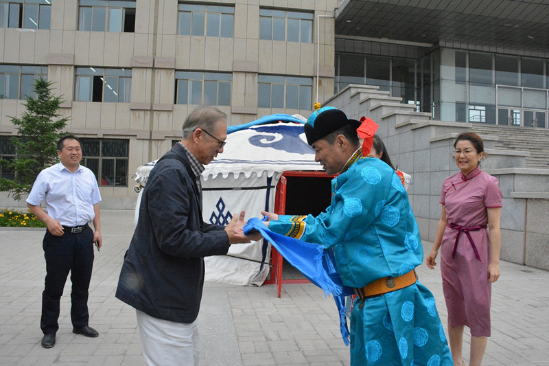格日乐图院长在天骄广场前以蒙古族礼仪迎接了卢沃棠先生一行。