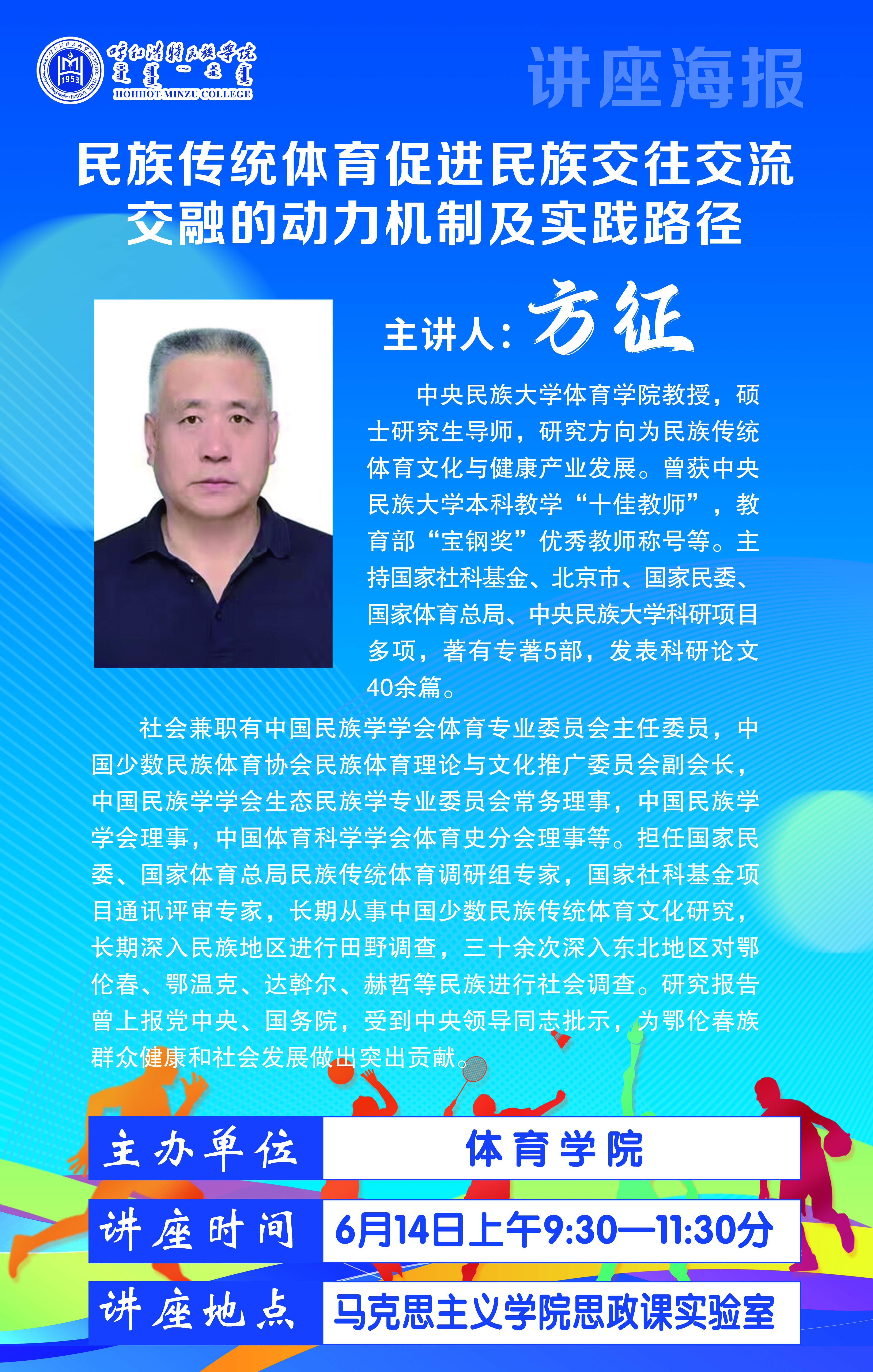 方征,中央民族大学体育学院教授,硕士研究生导师,研究方向为民族传统体育文化与健康产业发展。曾获中央民族大学本科教学“十佳教师”,教育部“宝钢奖”优秀教师称号等。主持国家社科基金、北京市、国家民委、国家体育总局、中央民族大学科研项目多项,著有专著5部,发表科研论文40余篇。