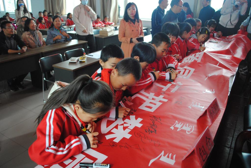 捐赠仪式结束后,与会领导及来宾、旗下营中心学校师生代表在“民族团结进校园 与爱同行把梦圆”的条幅上签名。