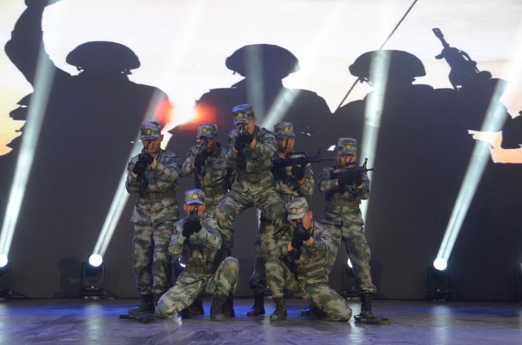 匍匐、翻滚、端枪、瞄准,教官战术表演动作配合精妙、游刃有余,展现了军队硬汉的铁血本色和高超本领。战术表演掀起了整场晚会的高潮。