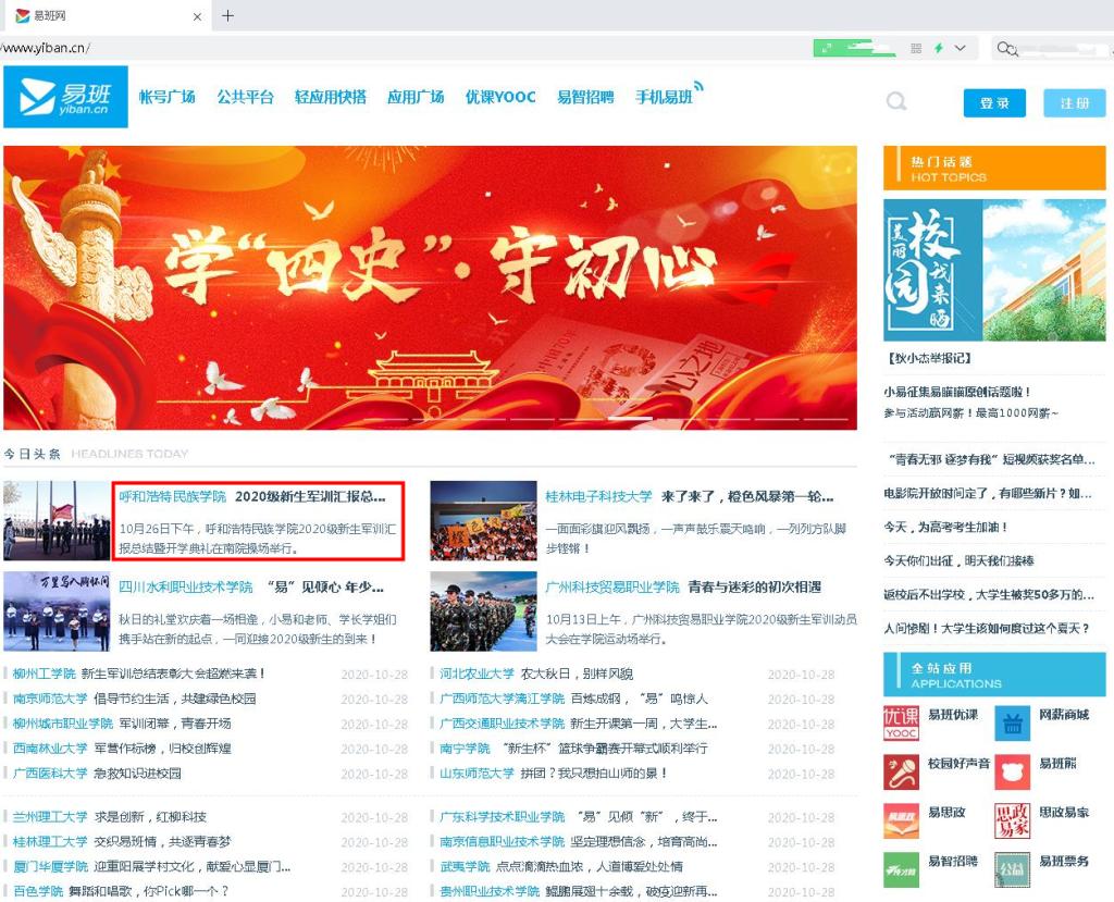 10月28日,全国易班网(http://www.yiban.cn/)今日头条刊登了“best365隆重举行2020级新生军训汇报总结暨开学典礼”的推文报道。这是续2018年以来再次荣登全国易班网“大头条”,提高了学校在全国共建高校中的影响力与知名度。