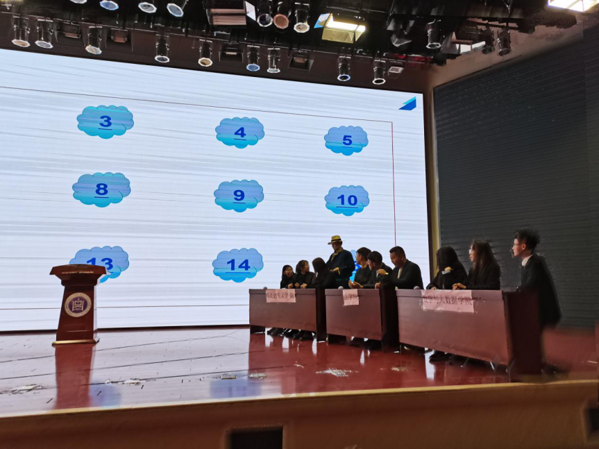 竞赛分三个阶段进行,第一阶段的选择题与第二阶段的判断题,各小组按顺序轮流作答,各队成绩势均力敌。来到激动人心的第三阶段抢答题环节,现场气氛持续升温,选手竞争激烈。数学与大数据学院选手势如破竹、一马当先,法学院紧跟其后,选手们的正确回答和积极抢答赢得了观众们热烈的掌声和赞叹。比赛现场还设置了观众互动提问环节,观众们热情参与,积极作答并获得了主办方提供的纪念品。在线上网络投票环节文学院以534票获得了最佳团队奖。