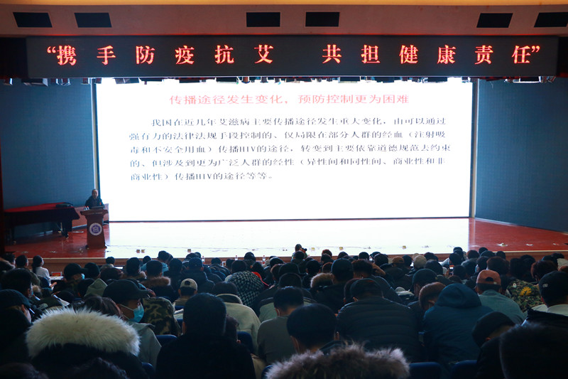 “携手防疫抗艾 共担健康责任”在第33个世界艾滋病日到来之际,按照自治区教育厅《关于组织开展2020年“世界艾滋病日”和“生殖健康知识进高校”宣传教育活动的通知》內教体函(2020)29号文件精神要求,11月30日晚由学生工作部、后勤管理处在学校图书馆二楼报告厅联合举办了艾滋病系列健康教育活动,本次活动得到了内蒙古自治区疾病预防控制中心和呼和浩特市新城区疾病预防控制中心的大力支持。内蒙古综合疾病预防控制中心性病艾滋病防治科主任杨景元教授、新城区疾病预防控制中心樊建华书记、学生工作部陈青春副部长、张玉梅副部长、后勤管理处楚长利处长、于海深副处长出席本次活动,活动由医务所刘晋雯所长主持。