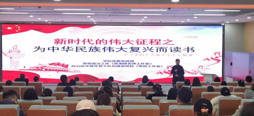 为深入学习贯彻党的十九届五中全会精神,学前教育学院、马克思主义学院、音乐学院联合主办,由学校党委宣讲团、自治区思想政治工作“张海峰名师工作室”、自治区中青年骨干队伍建设项目“思政工作室”承办,于12月10日晚上7点在图书馆一楼思政理论课教学基地举办了“学习贯彻党的十九届五中全会精神”宣讲会。宣讲会由学前教育学院党总支书记娜仁其木格主持,学前教育学院、马克思主义学院、音乐学院师生代表100余人参加宣讲会。