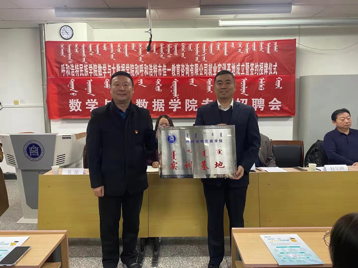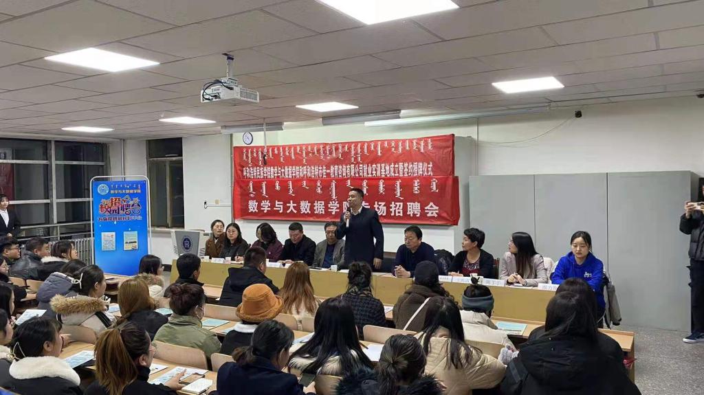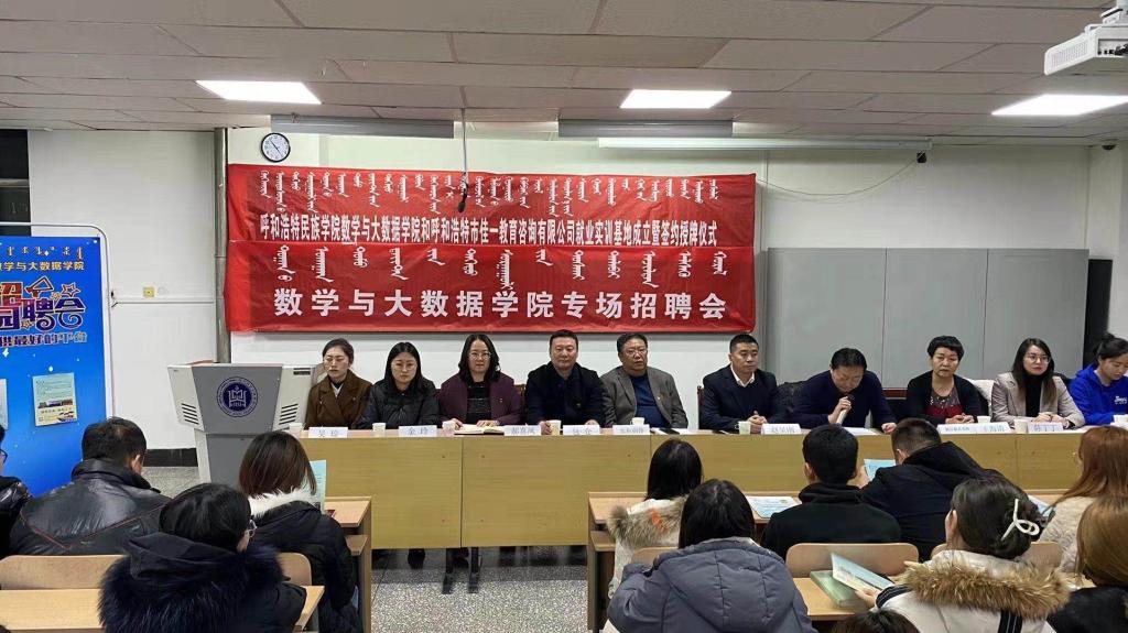 12月18日晚,best365官网中文版登录数学与大数据学院、呼和浩特市佳一教育咨询有限公司就业实训基地成立暨签约授牌仪式和专场招聘会举行。今后,数学与大数据学院将与呼和浩特市佳一教育咨询有限公司开展合作。党总支书记布和朝鲁、院长王海清、党总支副书记郝喜凤、副院长额尔顿其其格、辅导员金玲、佳一教育内蒙古区域总监赵呈刚先生、佳一教育人力资源部负责人陈丁丁女士、佳一教育人力专员维力斯女士出席仪式。