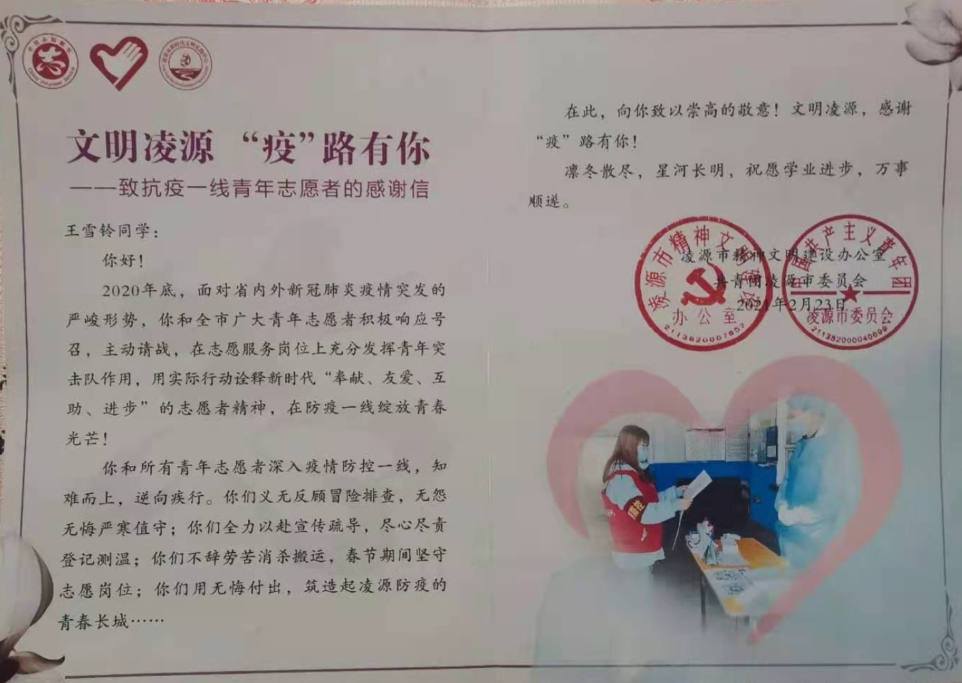 近日,学校团委收到了一封来自中共凌源市委,凌源市人民政府的感谢信。信中表扬了best365数学与大数据学院2019级小教二班王雪铃同学在疫情高发期主动加入凌源市疫情防控志愿服务,勇挑重担、表现积极,以实际行动彰显了民院学子的精神面貌,高度的社会责任感,体现了新时代青年的使命担当。