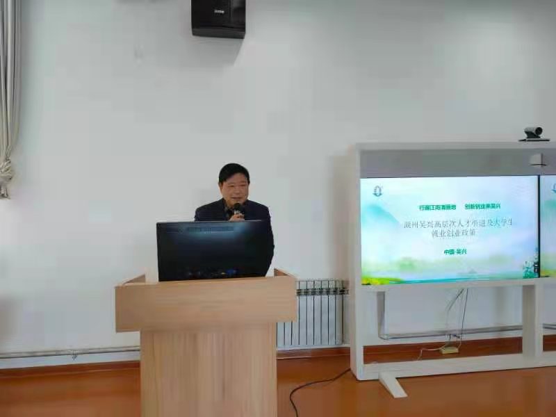 座谈会上,包仓处长对湖州市吴兴区人社局调研员黄新发一行表示了热烈欢迎。随后,与会人员一起观看了吴兴区招引宣传片。黄新发结合宣传片内容进一步详细介绍了吴兴区政府针对毕业生实习实训、就业等相关政策,企业代表们也逐一介绍了各企业的发展现状、薪资等具体情况。黄新发表示,希望能与学校共建培养平台,促进政企校深入合作,为企业输送急需的各类专业人才,推动开发区向更高层次发展。